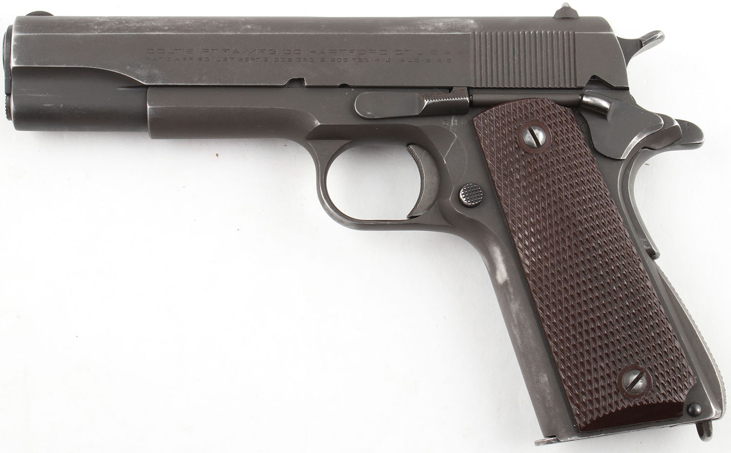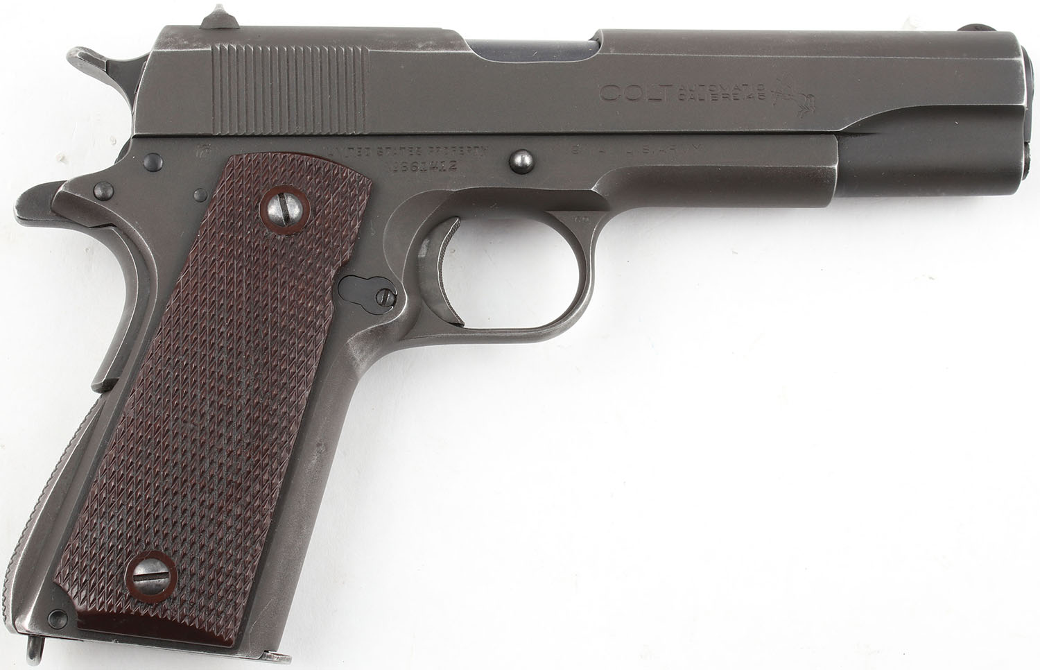 Colt, M1911A1 ''U.S. Army'', CAL: 45 ACP, MFG: 1943, SN: 861412, Single Action Semi Auto Pistol, 5'' Barrel. The replacement checkered plastic grip panels on the gun are excellent with minimal wear. The gun appears to have been arsenal refinished. The parkerized finish on the gun is very good with some wear from use and edge wear. The front strap has some exposed gun metal grey from use wear. The markings are pronounced and legible, including the ''United States Property'' mark on the frame and the ''P'' proof mark on the top of the slide. Bore is very good, bright with strong rifling and light even roughness throughout. Mechanically solid, seems to function well. The parts fitment is quite good, the slide/frame fitment is fairly tight with very little play. This gun seems to be well built and is an excellent example of a mid war production Colt. The slide holds standard GI 1911 sights with a ''U'' notch rear sight and blade front sight. The sights are parkerized and have an all black sight picture. Comes with a magazine. FFL or C&R Req. - Value: 1200 to 2400