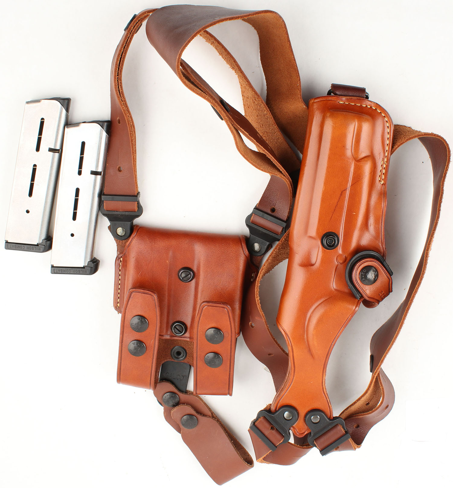 Colt, Gold Cup Commander National Match Custom Edition, CAL: 45 ACP, MFG: 1990, SN: GCC0107, Single Action Semi Auto Pistol, 4 1/4'' Barrel. The Magpul textured polymer grips are excellent, solid with light handling wear. The stainless finish on the gun is very good. There is substantial clean pitting around the gun, most notably on the right side of the frame near the magazine release and on the left side of the frame under the slide stop/slide release. This gun appears to have been badly rusted at some point but has been cleaned up well. Bore is good, bright with slightly thinned rifling. There is some deep pitting concentrated on the left side of the bore. Mechanically solid, seems to function well. The slide holds a windage and elevation adjustable rear sight and a front sight that appears to have been badly rusted and cleaned up. This gun was Magna ported from the factory, a process by which cuts are made on either side of the barrel in order to expel gas upwards to reduce recoil. Comes with three Wilson Combat magazines and a Galco ''Vertical Holster System'' shoulder holster. FFL Req. - Value: 1500 to 3000