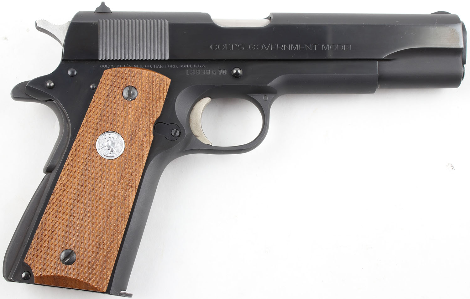BOXED Colt, MK IV Series 70 Government Model 1911, CAL: 45 ACP, MFG: 1976, SN: 13838G70, Single Action Semi Auto Pistol, 5'' Barrel. The factory checkered wood grips with Colt medallions are in excellent condition. The original blued finish on the sides of the slide and frame rates approximately 99% with minimal wear. The matte finish on the gun is excellent with minimal wear. Bore is excellent, bright with strong rifling. Mechanically solid, seems to function well. The parts fitment is good with play in the frame and slide one would expect from a factory Colt 1911 of this era, this gun seems to be very lightly used and is an excellent example of a Colt from the 70's. The slide holds fixed all black front and rear sights. Comes in the serially matched factory box with the plastic gun sleeve, a magazine and some related paperwork. FFL Req. - Value: 1000 to 1600