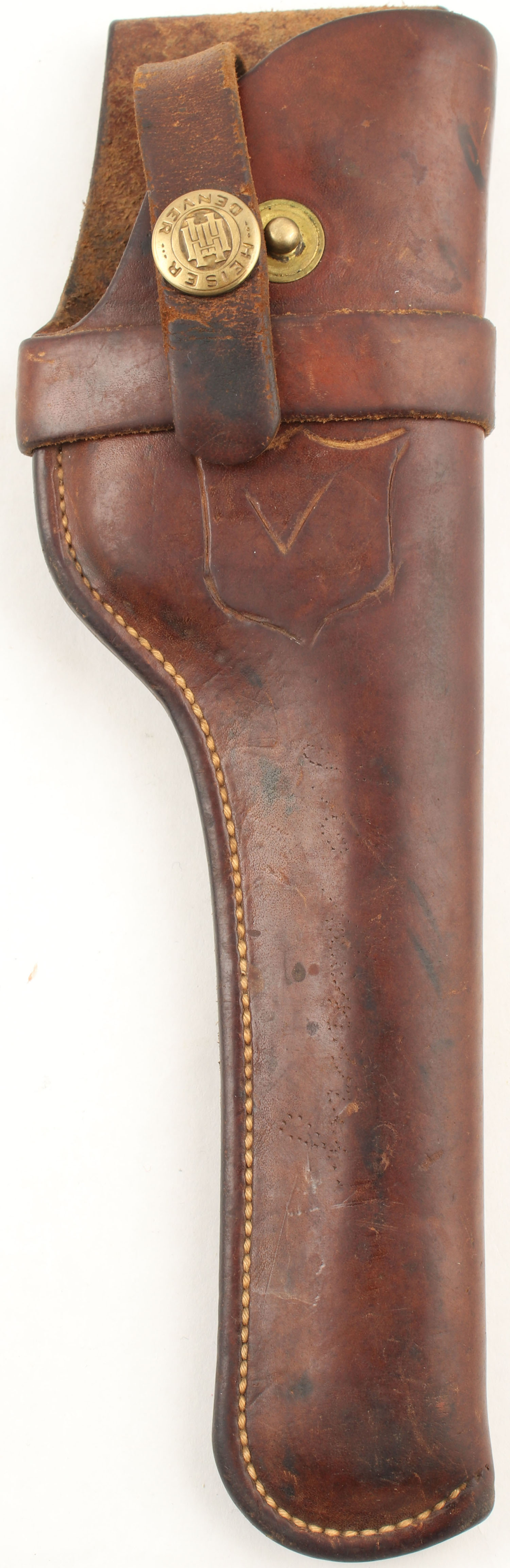 Colt, Woodsman 1st Series Target, CAL: 22 LR, MFG: 1937, SN: 107233, Semi Auto Pistol, 6 5/8'' Barrel. The factory checkered wood grips are in very good condition, solid with worn checkering and very light edge chipping. The blued finish on the gun rates approximately 80% with some handling and holster wear. Most of the wear is concentrated on the front strap and backstrap of the grip. Bore is excellent, bright with strong rifling. Mechanically solid, seems to function well. The barrel holds a fixed front sight, there is a rear sight set in a dovetail cut on the slide. The sight picture is all black. Comes with a magazine and a leather holster that fits the gun nicely. FFL or C&R Req. - Value: 500 to 900