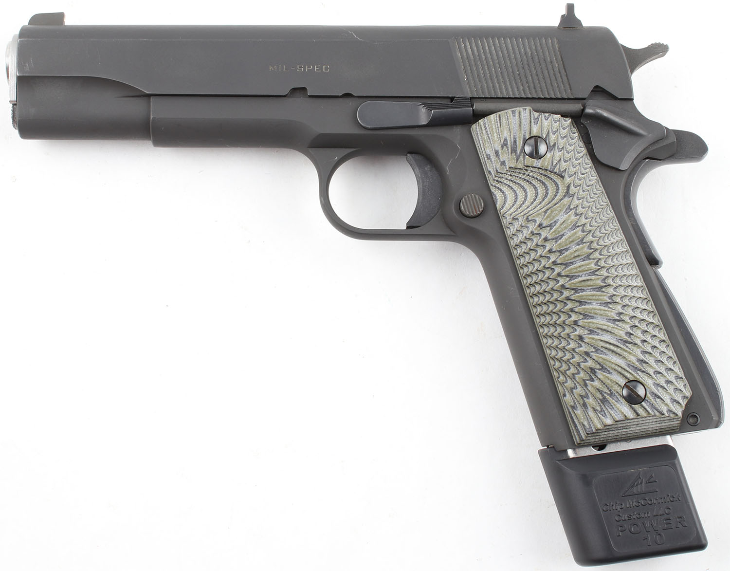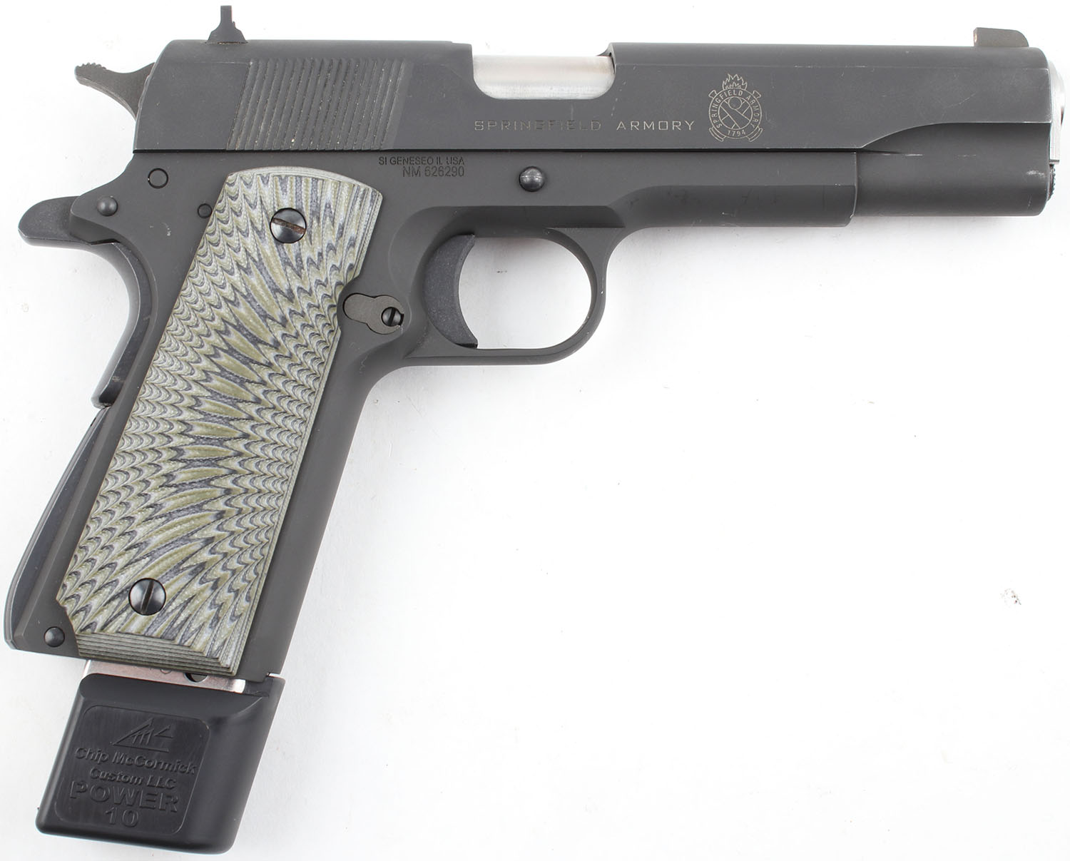 Springfield Armory, 1911 Mil-Spec, CAL: 45 ACP, MFG: Modern, SN: NM626290, Single Action Semi Auto Pistol, 5'' Barrel. The gun comes with aftermarket grips installed but has the original grips in the case. The aftermarket G10 grips are in excellent condition with minimal wear. The factory checkered wood grips are also excellent with little to no wear. The parkerized finish on the gun is very good with minimal handling wear and some small surface scratches throughout. Bore is excellent, bright with strong rifling. Mechanically solid, seems to function well. The parts fitment is good, as one might expect from a modern factory Springfield 1911, the slide and frame have little play. The slide holds fixed 3 dot white sights. The gun comes with a generic hard plastic case, a 10 round magazine, and the original grips. FFL Req. - Value: 500 to 1000