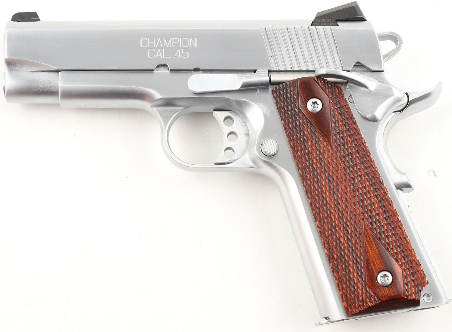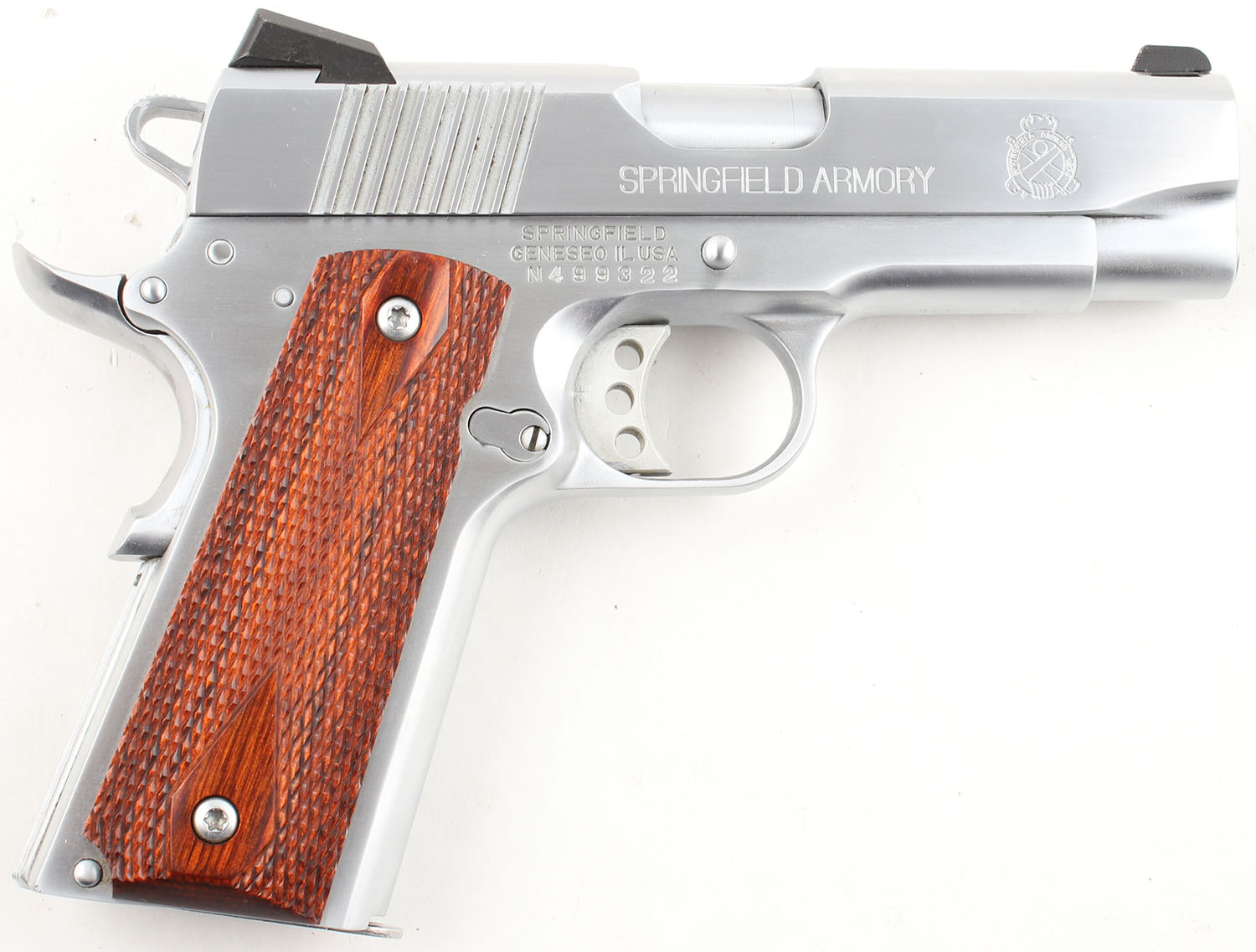 Springfield Armory (IMBEL Brazil), Champion (Commander 1911), CAL: 45 ACP, MFG: Modern, SN: NM626290, Single Action Semi Auto Pistol, 3 7/8'' Barrel. The factory checkered wood grips are excellent with little to no wear. The stainless steel finish on the gun is excellent with minimal handling wear. Bore is excellent, bright with strong rifling. Mechanically solid, seems to function well. The parts fitment is good, the slide and frame have some play. The slide has slightly more play than one would expect from a Springfield 1911. The gun has fixed 3 dot white sights, both of which are set in dovetail cuts on the slide. The gun comes in the serially matched factory case with two Kimber magazines, an owners manual, and other related paperwork. FFL Req. - Value: 500 to 1000