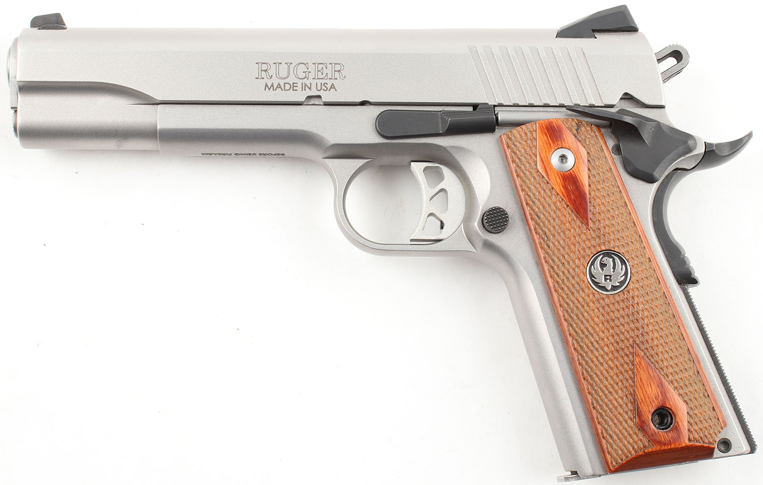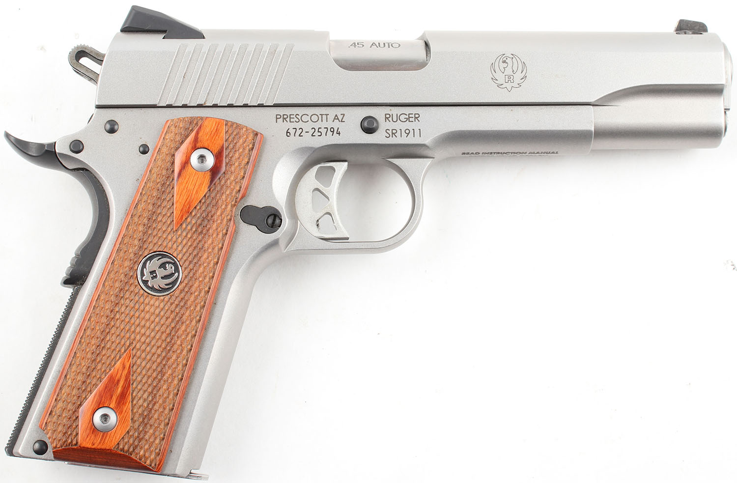 Ruger, SR1911, CAL: 45 ACP, MFG: 2015, SN: 672-25794, Single Action Semi Auto Pistol, 5'' Barrel. The factory checkered wood grips with Ruger medallions are excellent with little to no wear. The stainless steel finish on the gun is excellent with minimal handling wear. Bore is excellent, bright with strong rifling. Mechanically solid, seems to function well. The parts fitment is good, the slide and frame have little play. The gun seems to have parts fitment that is standard for Ruger 1911's. The slide holds fixed 3 dot white sights, both of which are set in dovetail cuts on the slide. The gun comes in a Cabela's soft case with two Ruger magazines. FFL Req. - Value: 400 to 800