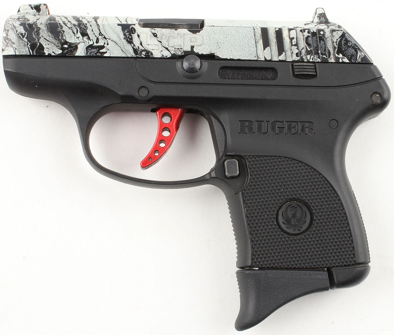Ruger, LCP, CAL: 380 Auto, MFG: Modern, SN: 371659540, Double Action Only Semi Auto Pistol, 2 3/4'' Barrel. The polymer grip frame is excellent with little to no wear. The slide appears to have been ''Hydrodipped'' leaving a coat of paint, the paint is fairly intact with some original finish showing on the worn edges. Bore is excellent, bright with strong rifling. Mechanically solid, seems to function well. The trigger appears to have been replaced with a skeletonized red metal trigger. The function of the trigger does not seem different from a standard LCP in any way (Including pull weight). The slide holds fixed iron sights that are coated in the same paint as the slide, the front sight appears to have been painted orange. The gun comes with a magazine. FFL Req. - Value: 100 to 300