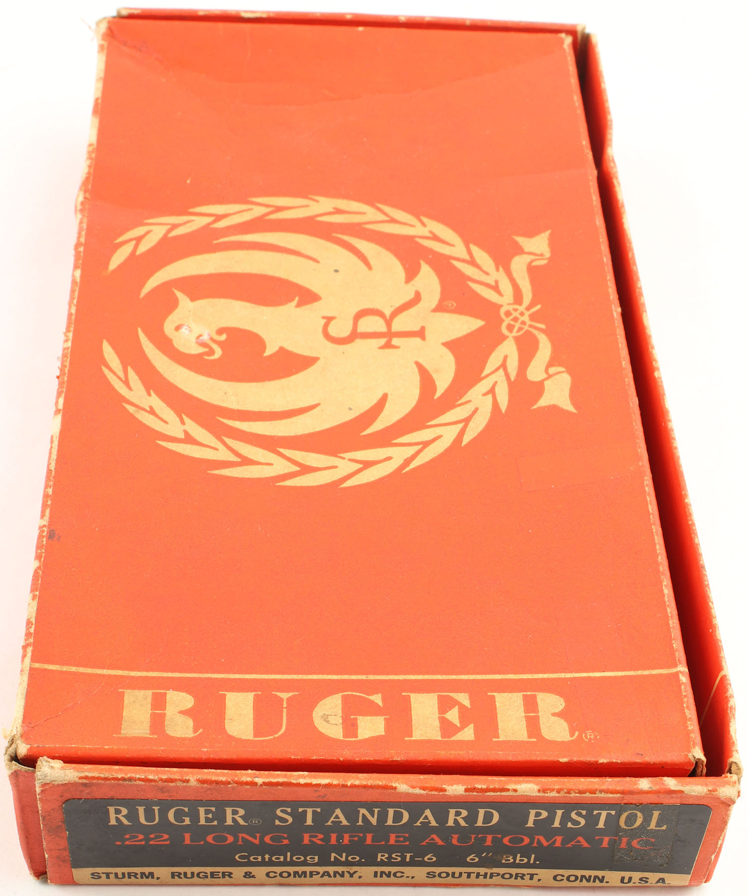 Ruger, Standard, CAL: 22LR, MFG: 1973., SN: 12-09433, Semi Auto Pistol, 6'' Barrel. The checkered plastic grip panels are excellent with minimal wear & a couple of small dings. The black finish on the gun is very good. There is light rust speckling throughout with more concentrated speckling on the front strap & backstrap of the grip. Bore is excellent, bright with strong rifling. Mechanically solid, seems to function well. The barrel holds fixed all black sights, the front sight seems to have been painted orange. Comes with a correct Ruger Standard box with wax paper & a magazine. FFL or C&R Req. - Value: 250 to 500
