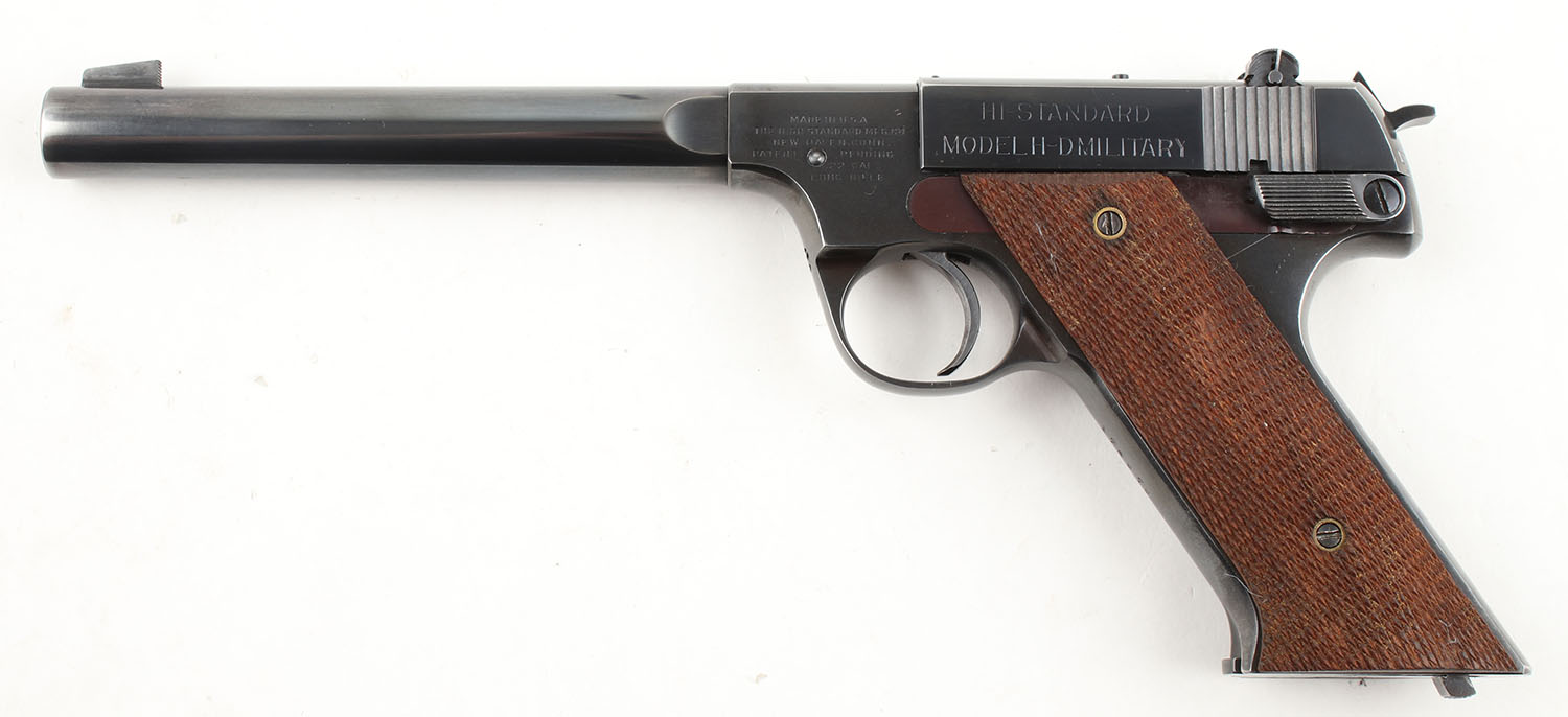 Hi Standard, Model H-D Military, CAL: 22 LR, MFG: 1946, SN: 174979, SAO Semi Auto Pistol, 6 3/4'' Barrel. The checkered wood grips are excellent, solid with minimal wear. The original blued finish on the slide & frame rates approximately 95%, the blue on the slide light edge wear. The blue on the frame has some handling wear & has begun to tone to a plumb patina. The blue on the barrel has slightly thinned & has edge wear near the muzzle. Bore is excellent, bright with strong rifling. Mechanically solid, seems to function well. A fixed black front sight is integral to the barrel, a fixed black rear sight is set in a dovetail cut on the slide. Comes with a magazine. FFL or C&R Req. - Value: 250 to 500