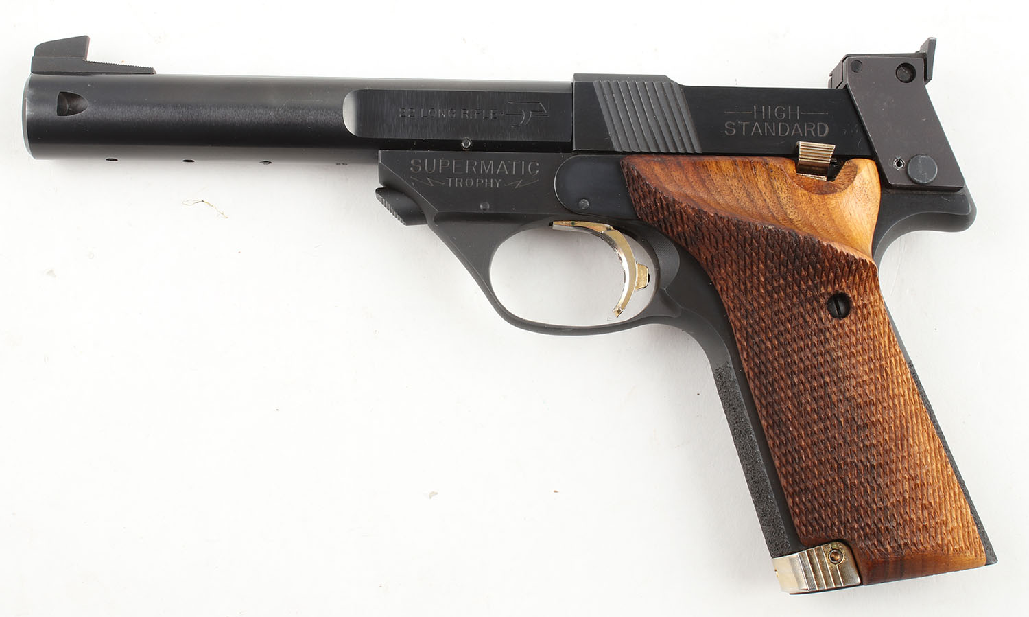 High Standard, ''Military Supermatic Trophy'', CAL: 22 LR, MFG: 1973, SN: 2464469, Semi Auto Pistol, 5 1/2'' Barrel. The checkered wood grips with thumb rest are excellent, solid with minimal wear. The blued finish rates approximately 98% with a couple of small surface scratches. Bore is very good, near excellent, bright with slightly thinned rifling. Mechanically solid, seems to function well. A fixed black front sight is screwed to the barrel, a black windage & elevation adjustable rear sight is bolted to the frame. No magazine. FFL or C&R Req. - Value: 500 to 1000