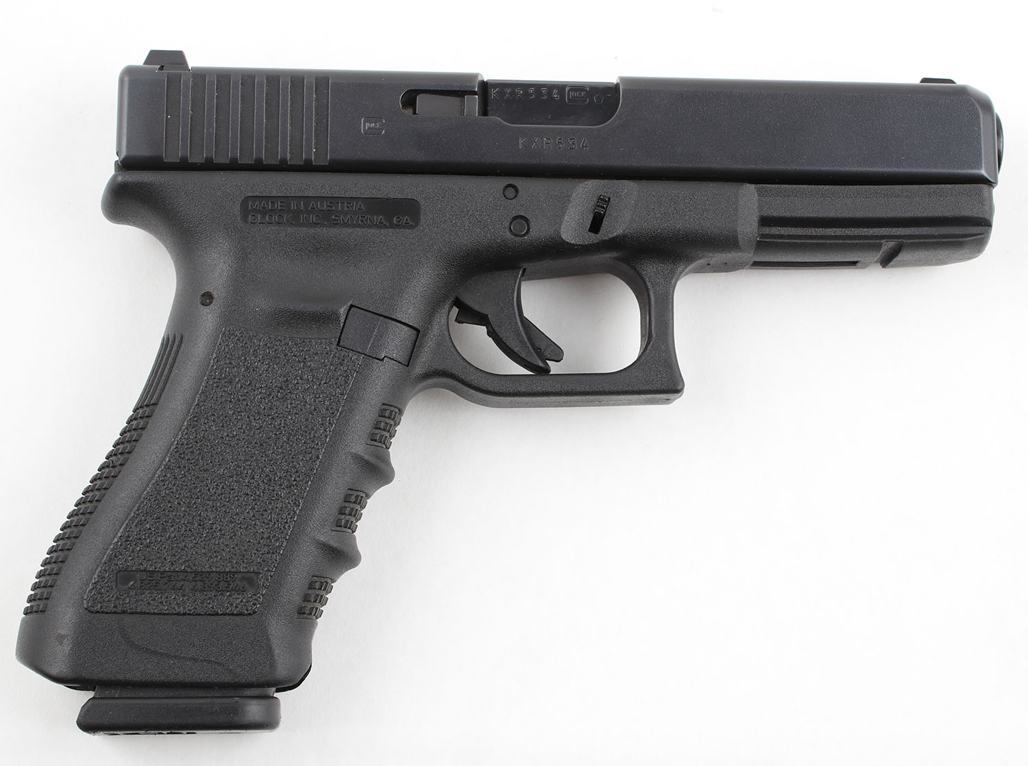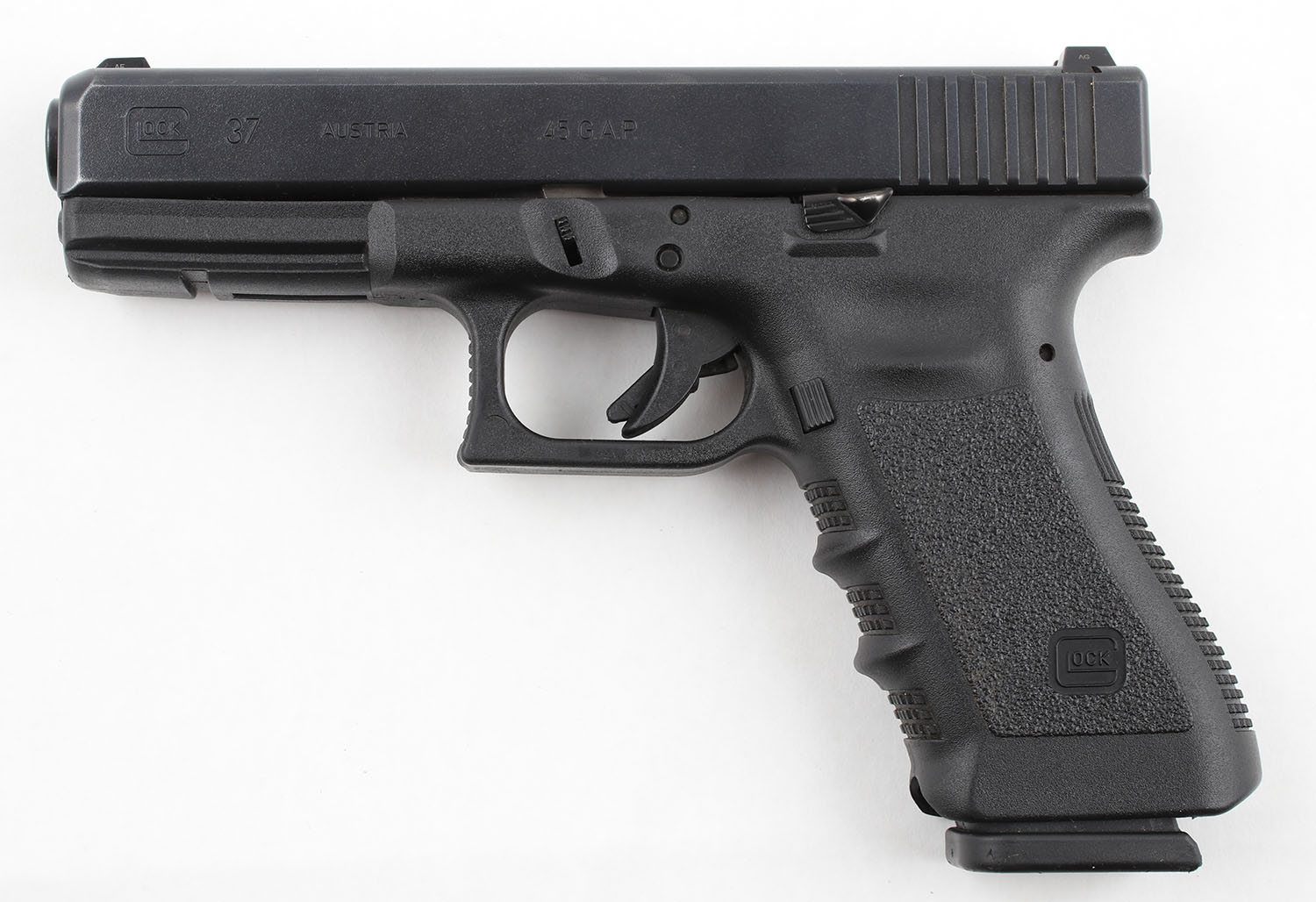 Glock (Austria), 37 Gen 3, CAL: 45 GAP (Not compatible with 45 ACP), MFG: Modern, SN: KXR534, Semi Auto Pistol, 4 1/2'' Barrel. The polymer grip frame is excellent with very light wear. The black finish on the slide & barrel is excellent with minimal wear. Bore is excellent, bright with strong rifling. Mechanically solid, seems to function well. The slide holds factory plastic Glock sights. Comes with one 10 round magazine. FFL Req. - Value: 300 to 500