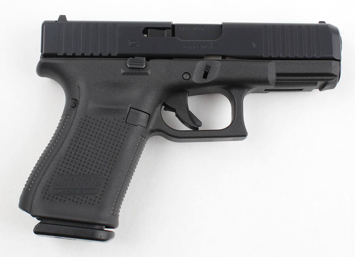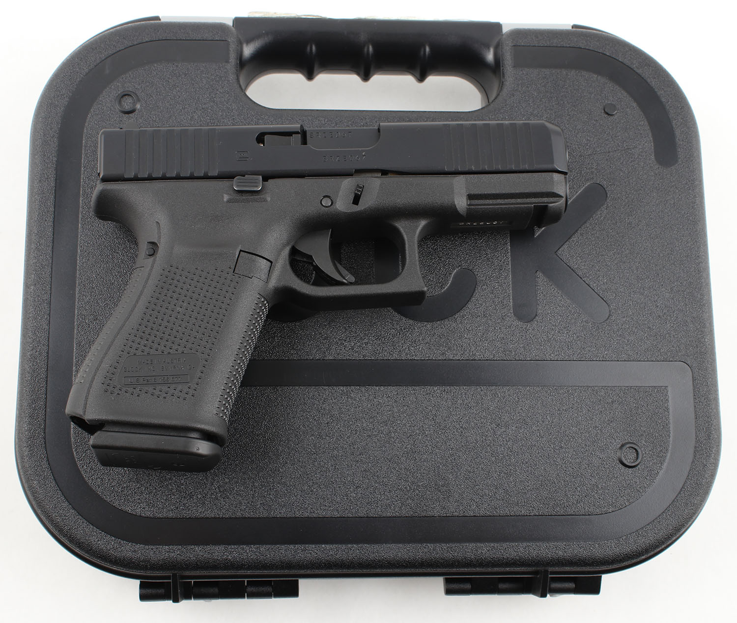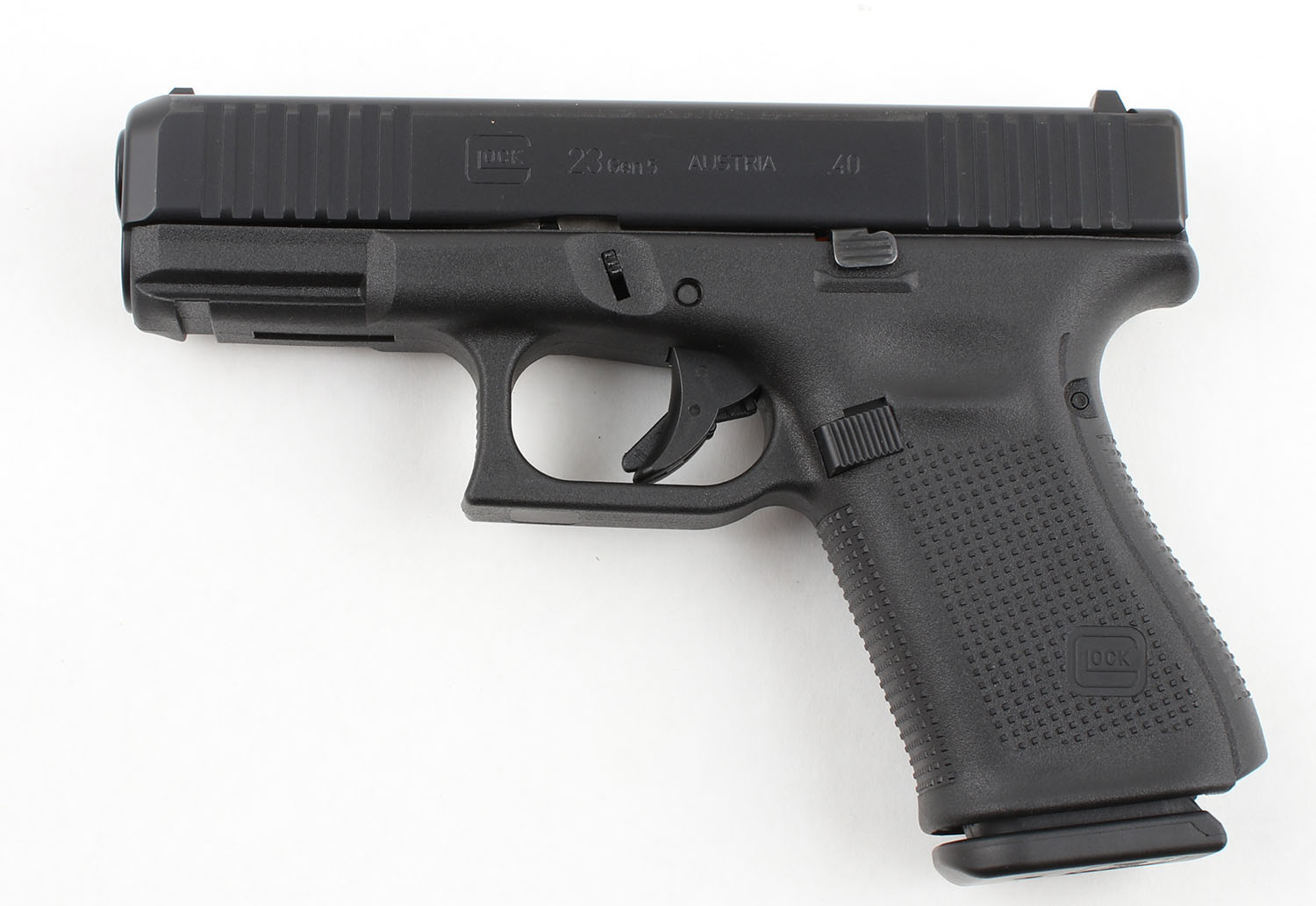 CASED Glock (Austria), 23 Gen 5, CAL: 40 S&W, MFG: Modern, SN: BRZE067, Semi Auto Pistol, 4'' Barrel. The polymer grip frame is excellent with minimal wear. The black finish on the slide & barrel is excellent with minimal wear. Bore is excellent, bright with strong rifling. Mechanically solid, seems to function well. The factory plastic Glock sights. Comes in the serially matched factory plastic hard case with three 13 round magazines, a speed loader, four backstraps, a punch tool for replacing the backstraps, a bore brush, a cleaning rod, an owners manual, & other related paperwork. FFL Req. - Value: 400 to 600