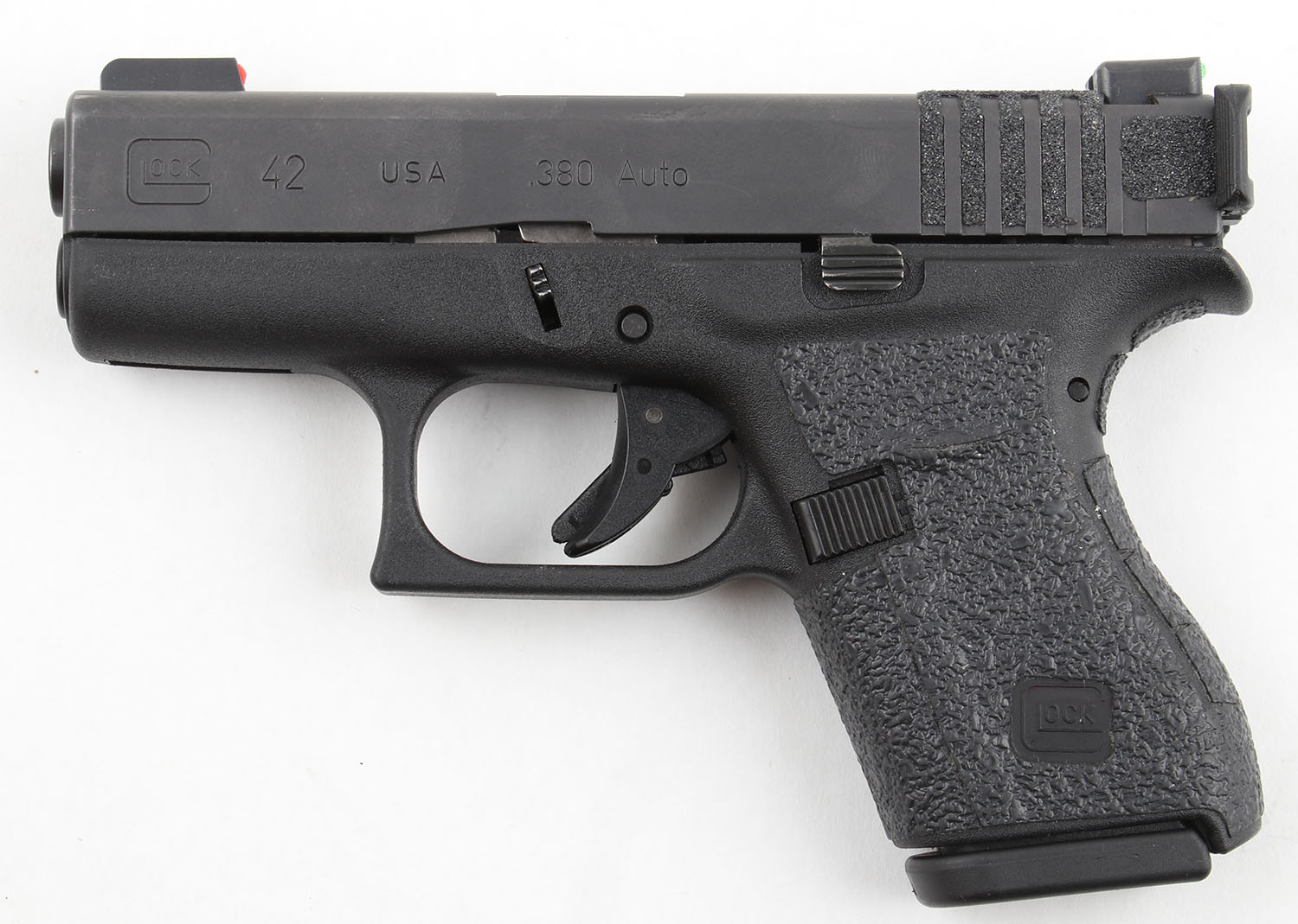 CASED Glock (USA), 42, CAL: 380 ACP, MFG: Modern, SN: AFNA962, Semi Auto Pistol, 3 1/4'' Barrel. The polymer grip frame is excellent with very light wear. The grip holds Talon grip tape with rubberized texture. The black finish on the slide & barrel is very good, near excellent, with light handling wear & light edge wear concentrated on the top edges of the slide. The rear slide serrations hold aggressive (sand paper like) Talon tape for better grip. The rear slide plate has been replaced with an extended plate that has serrated wings which hang over the left & right edges of the slide by approximately 0.15 inches. The combination of the grip tape & winged slide plate makes the slide incredibly easy to hang on to while charging the weapon. Bore is excellent, bright with strong rifling. Mechanically solid, seems to function well. The slide holds 3 dot fiberoptic contrast sights, the front sight being red & the rear being green. Comes in the serially matched factory hard plastic case with one 6 round magazine, a speed loader, a bore brush, an owners manual, & other related paperwork. FFL Req. - Value: 300 to 450