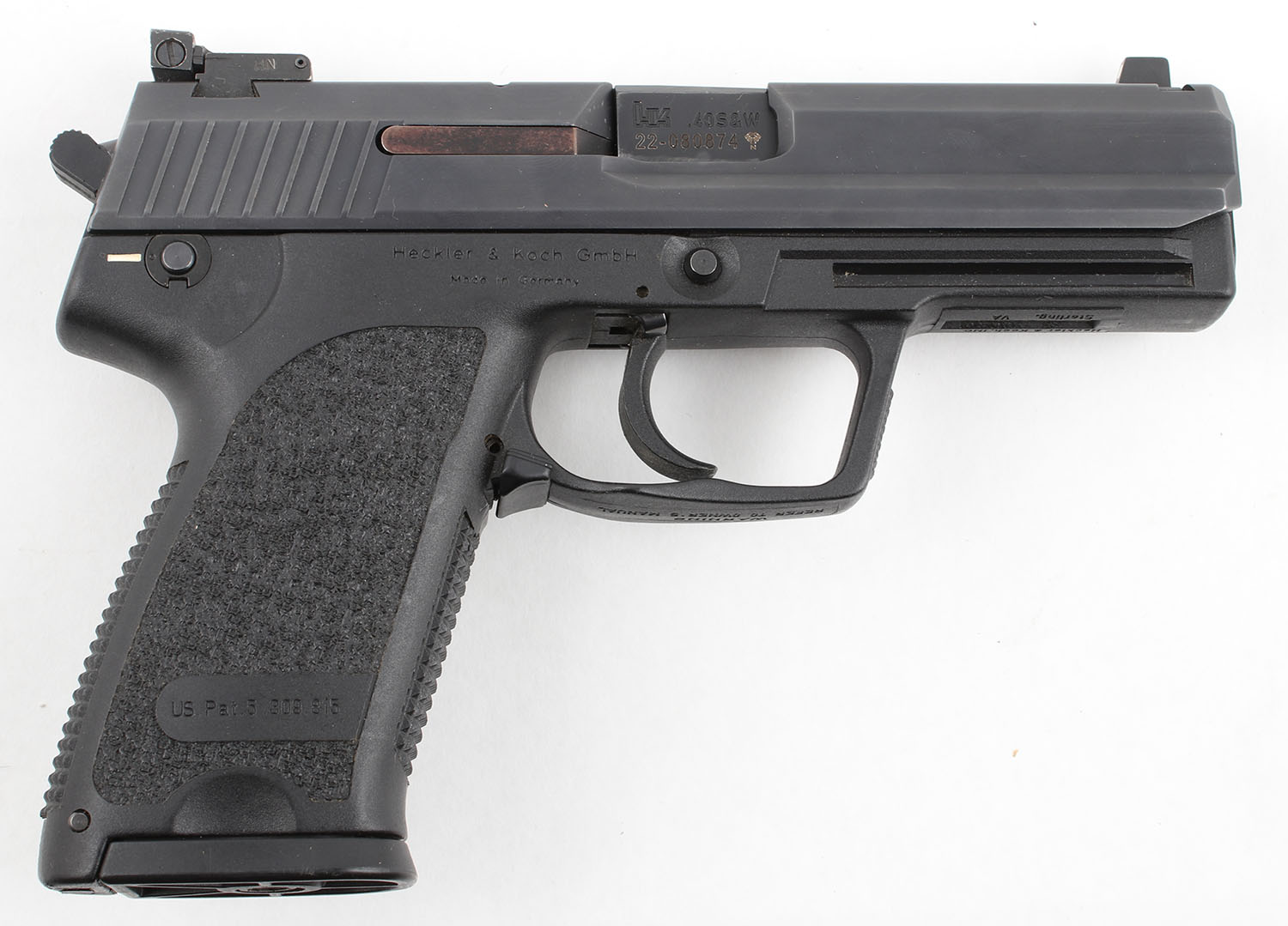 Heckler & Koch (H&K, Germany), USP, CAL: 40 S&W, MFG: 2007, SN: 22-080874, Double Action/Single Action Semi Auto Pistol, 4 1/4'' Barrel. The polymer grip frame is excellent with very light wear. The black finish on the slide & barrel is very good, near excellent, with light handling wear. Bore is excellent, bright with polygonal rifling. Mechanically solid, seems to function well. The slide holds Tru Dot suppressor height night sights. The rear sight is windage & elevation adjustable, the front sight is fixed. The sight picture is 3 white dots, the sights are incredibly dim. Comes with one 10 round magazine. FFL Req. - Value: 400 to 800