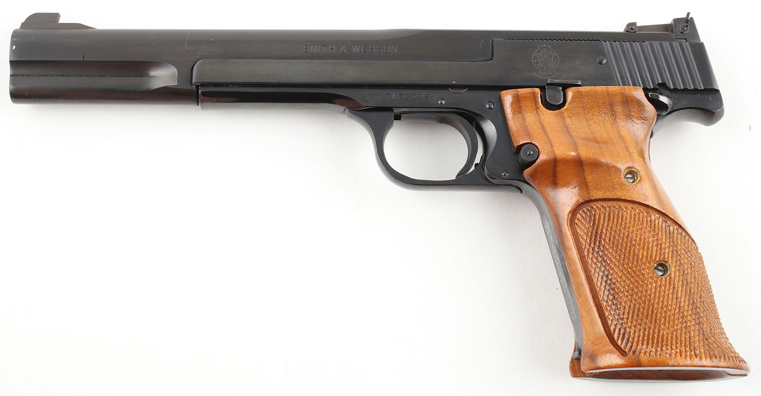 Smith & Wesson, Model 41, CAL: 22 LR, MFG: 1980's-90's, SN: TAF2399, Semi Auto Pistol, 7'' Barrel. The factory checkered wood grips are very good, near excellent, solid with minimal wear. There is a small chip on the right grip panel near the bottom of the trigger guard. The blued finish on the gun rates approximately 95% with nearly full coverage. The blue on the slide has begun to thin & tone to a plumb patina. Bore is excellent, bright with strong rifling. Mechanically solid, seems to function well. A fixed black front sight is integral to the barrel, a windage & elevation adjustable rear sight is mounted to the slide. Comes with a magazine. FFL Req. - Value: 900 to 1600