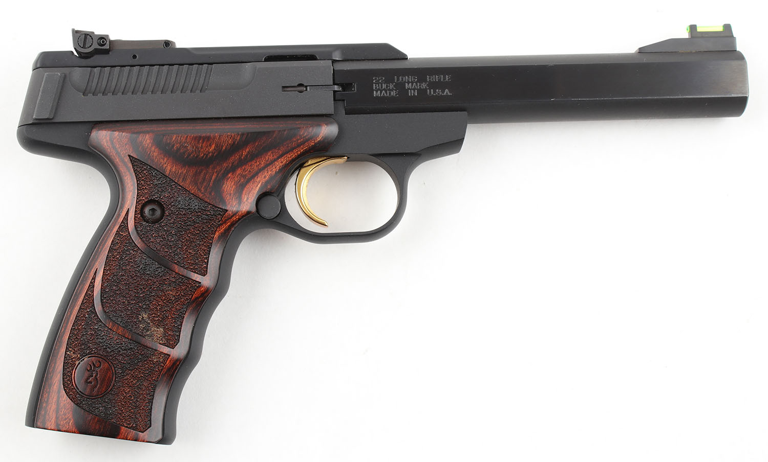 Browning (USA), Buckmark Plus UDX, CAL: 22LR, MFG: Modern, SN: 515ZZ06185, Semi Auto Pistol, 5 1/2'' Barrel. The factory textured wood grips are excellent with minimal wear. The black finish on the gun is excellent with minimal wear, there are some surface scratches on the bottom of the barrel. Bore is excellent, bright with strong rifling. Mechanically solid, seems to function well. The barrel holds a front fiberoptic sight. A top strap holding a serrated all black windage & elevation adjustable rear sight is bolted to the top of the frame & barrel. Comes with one magazine. FFL Req. - Value: 300 to 600