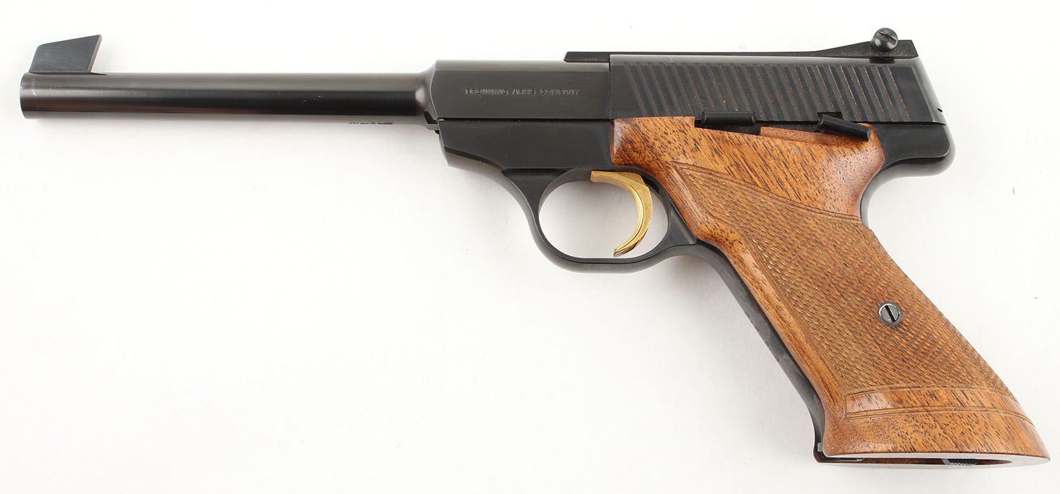 Browning (Belgium), Challenger, CAL: 22 LR, MFG: 1966, SN: 61929U6, Semi Auto Pistol, 6 3/4'' Barrel. The checkered wood grips are very good, near excellent, solid with several shallow dings & surface scratches throughout. The blued finish rates approximately 97% with a couple small splotches of exposed gun metal gray on the barrel & frame. Bore is excellent, bright with strong rifling. Mechanically solid, seems to function well. A fixed black front sight is integral to the barrel, a black rear sight is mounted to a bolted on top strap on the frame. Comes with a magazine. FFL or C&R Req. - Value: 400 to 600
