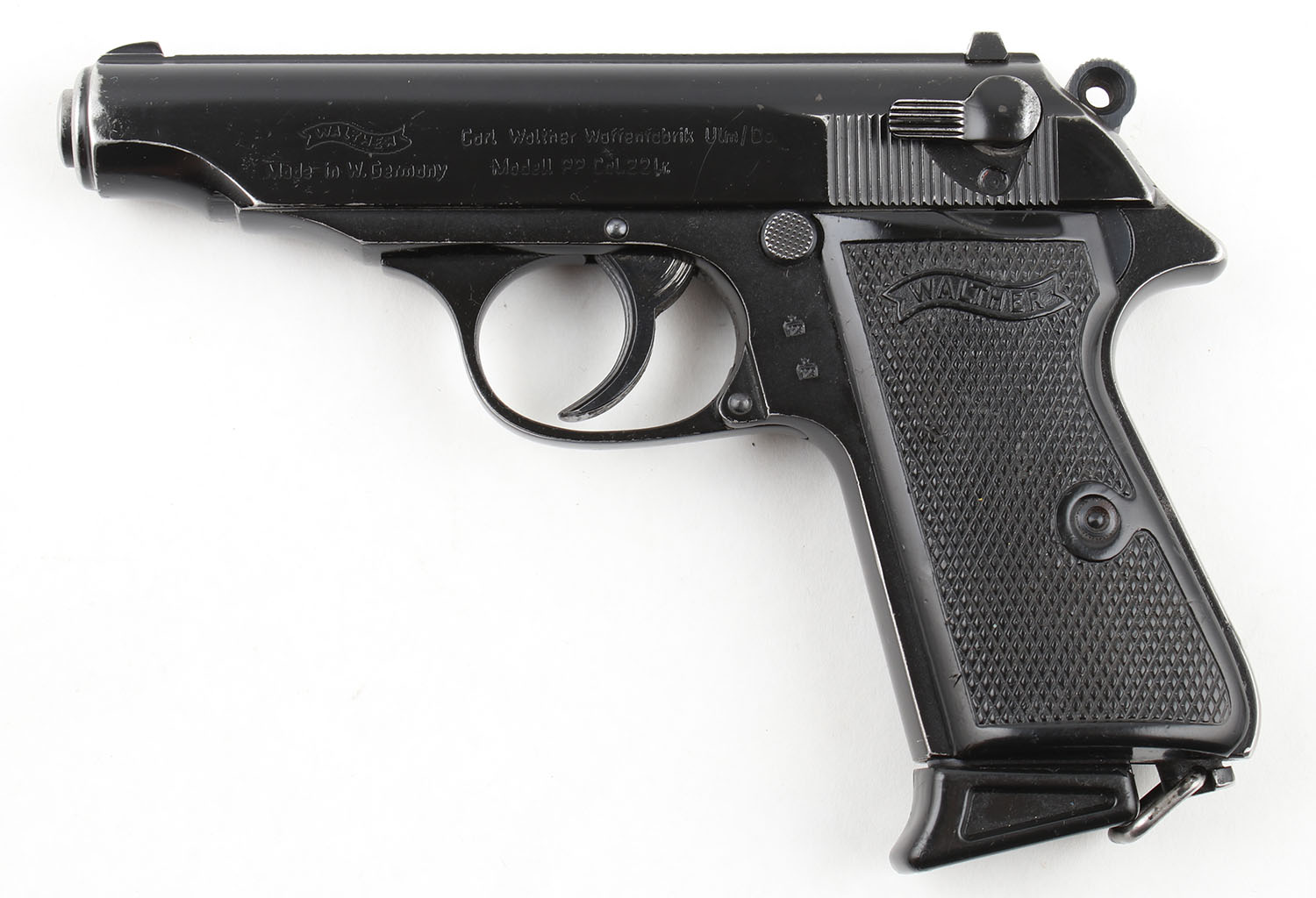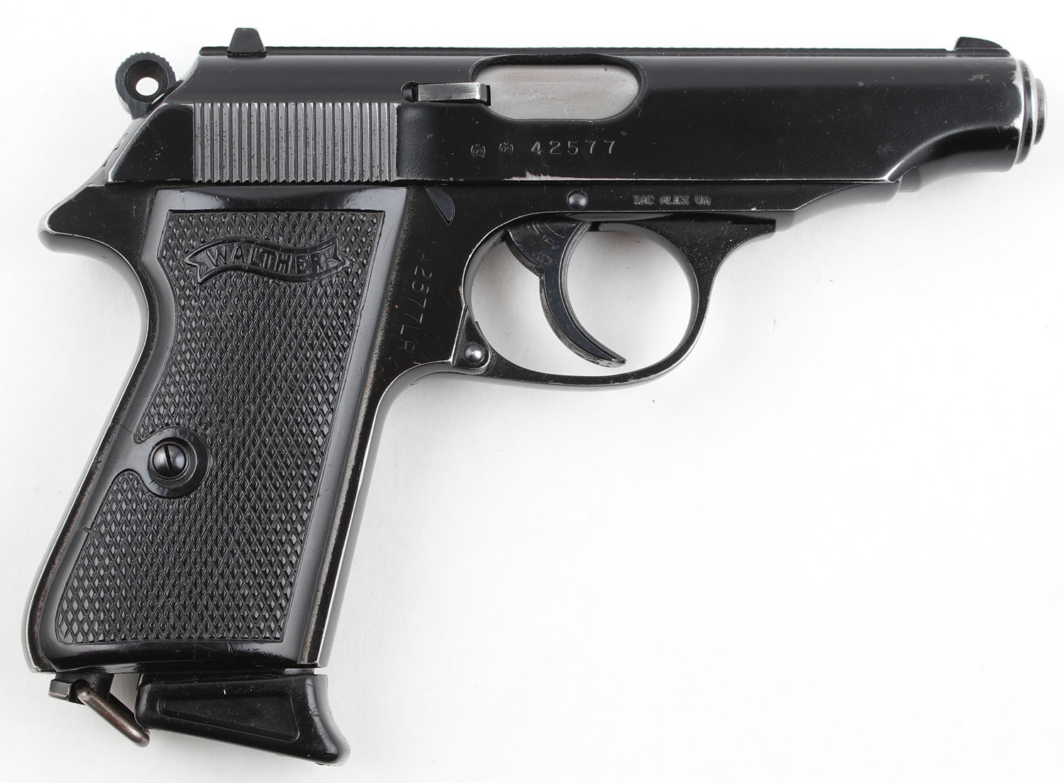 HISTORY: In 1974, the British Royal Army Ordnance Corps purchased approximately 3,000 .22 LR Walther PP pistols to issue as Personal Defense Weapons (PDWs) to service members of the Ulster Defense Regiment. Approximately 1,500 of which would make their way to the US. These were to be issued to servicemembers who faced personal threats to their lives. It is very uncommon for militaries to issue firearms for off duty personal protection & even more uncommon for .22 LR firearms to be purchased or issued by militaries for use as PDWs. In about 1980 many of them were refinished with a black lacquer coating called Suncorite (This coating is no longer used due to being a hazardous material) and refitted with strengthened firing pins. The slide is typically marked if the firing pin was replaced, this particular example is not marked & likely did not receive a reinforced firing pin. In 1989 they were officially replaced as PDWs by the Walther P5 and SIG P230, and sold as surplus by the military. The sale of modern or semi-modern British military firearms as surplus is quite rare. They show up today in both European and American collector circles, often not recognized as actual British military-issue pistols due to the generally correct assumption that a 22 LR German pistol with what appears to be a black paint finish would likely not be a semi modern British military pistol that has made its way to the commercial market. This gun is unique for a number of reasons & would be a neat addition to any military collection.