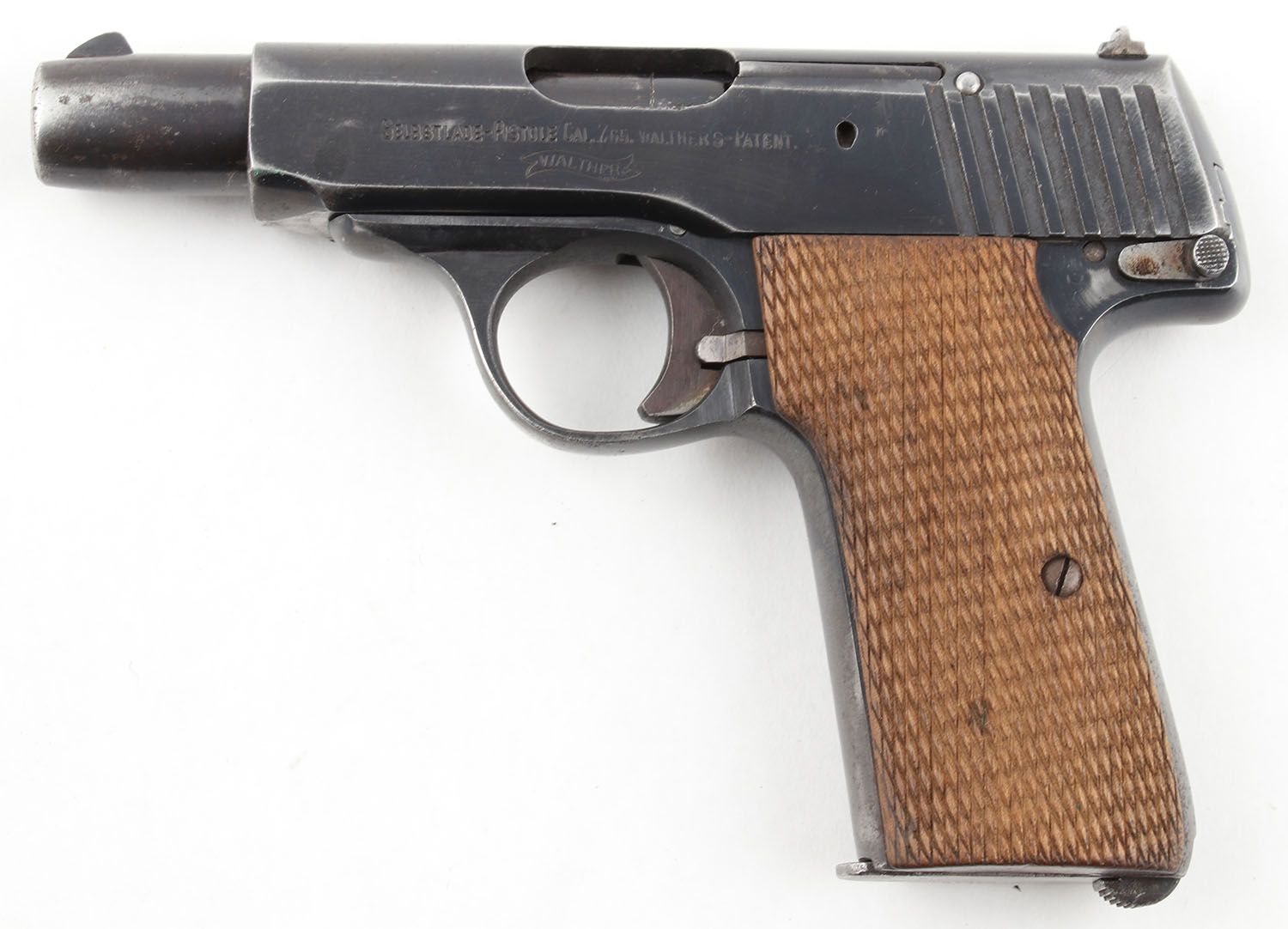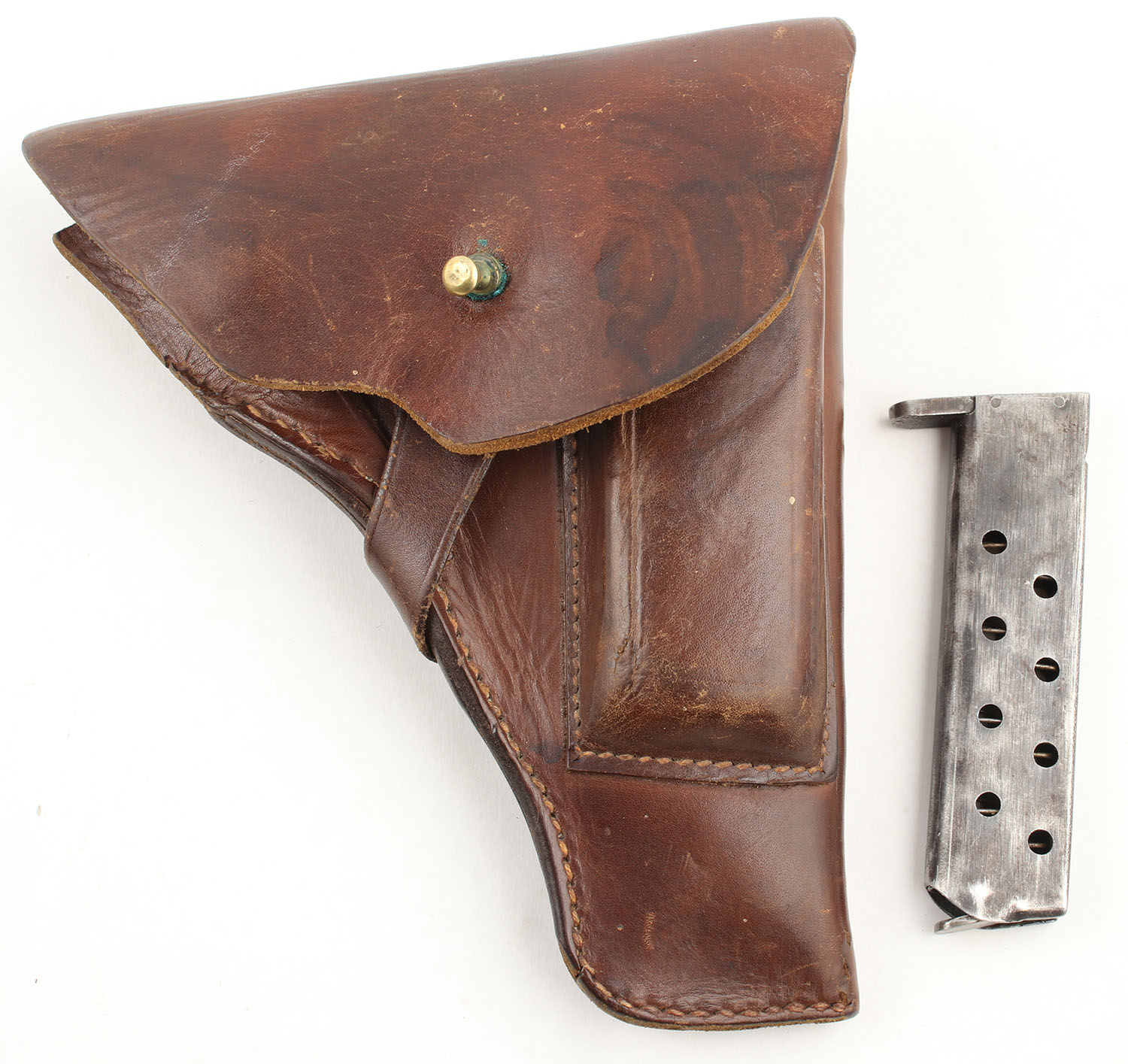 Walther, Model 4 ''Late Type 2'', CAL: 32 ACP, MFG: 1916-19, SN: 175402, Semi Auto Pistol, 3 3/8'' Barrel. The checkered wood grips are excellent with minimal wear. The gun seems to have been reblued. The blue rates approximately 80% with substantial handling & holster wear. Bore is good, it has darkened with rifling that is very thin but still pronounced. The bore has even roughness throughout & light pitting. Mechanically solid, seems to function well. Rudimentary all black sights are fixed to the slide. Comes with a correct leather holster, one factory magazine, & one other magazine that has been retrofitted to fit in the gun. FFL or C&R Req. - Value: 200 to 800