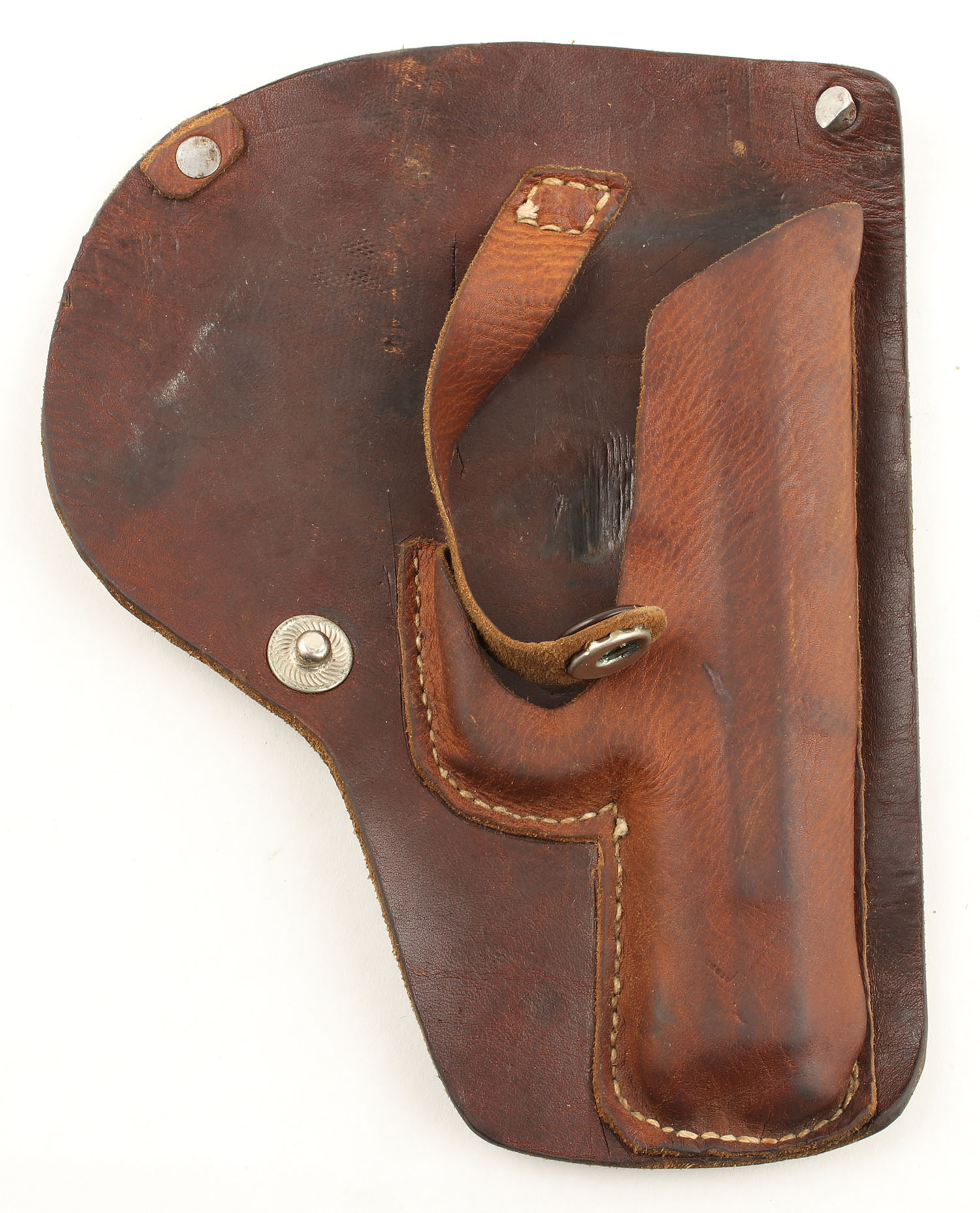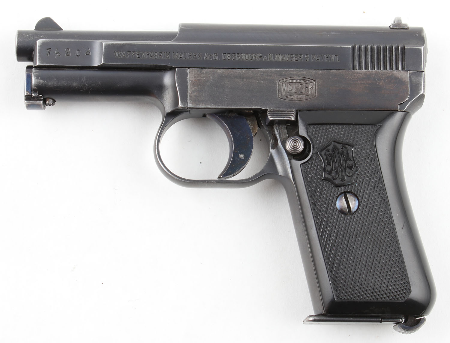 Waffenfabrik Mauser A.G. Oberndorf, Model 1910 ''New Model'', CAL: 25 ACP, MFG: 1914-41, SN: 74202, Semi Auto Pistol, 3'' Barrel. The checkered plastic grips are excellent & solid with some light handling wear. The original blued finish rates 80%. There is some handling wear & holster wear. Bore is very good. Mechanically solid. Factory rear ''v'' notch, with blade front sight. Comes in a leather holster, with a magazine. FFL or C&R Req. - Value: 400 to 800