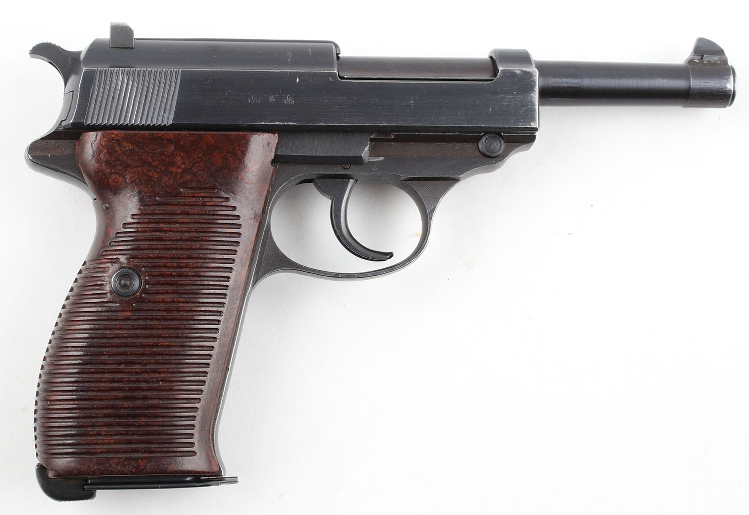 Mauser, P38, CAL: 9mm, MFG: 1943, SN: 8793, DA/SA Semi Auto Pistol, 5'' Barrel. The bakelite grips are excellent with some handling wear. The metal holds what appears to be an arsenal re-blued finish. The blue on the gun rates approximately 97%. The finish has light handling wear & edge wear. There are some small dings & scratches throughout. The right side of the slide has two German Army Waffenamts with an Iron Eagle between them, these marks are worn very thin. The rest of the markings are also thin but far more clear & legible, this is likely from being buffed during the arsenal re-blue. The serial numbers on the frame, slide, & front flat of the barrel match. Bore is very good, bright with strong rifling but substantial pitting in the groves of the rifling next to the lands. Mechanically solid, seems to function well. A fixed all black front sight is set in a dovetail cut on the barrel, a fixed all black rear sight is set in dovetail cut on the slide. Comes with an 8 round magazine. FFL or C&R Req. - Value: 700 to 1400