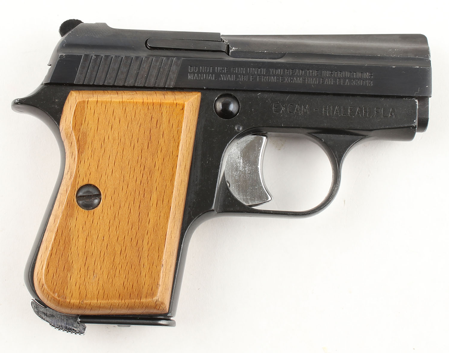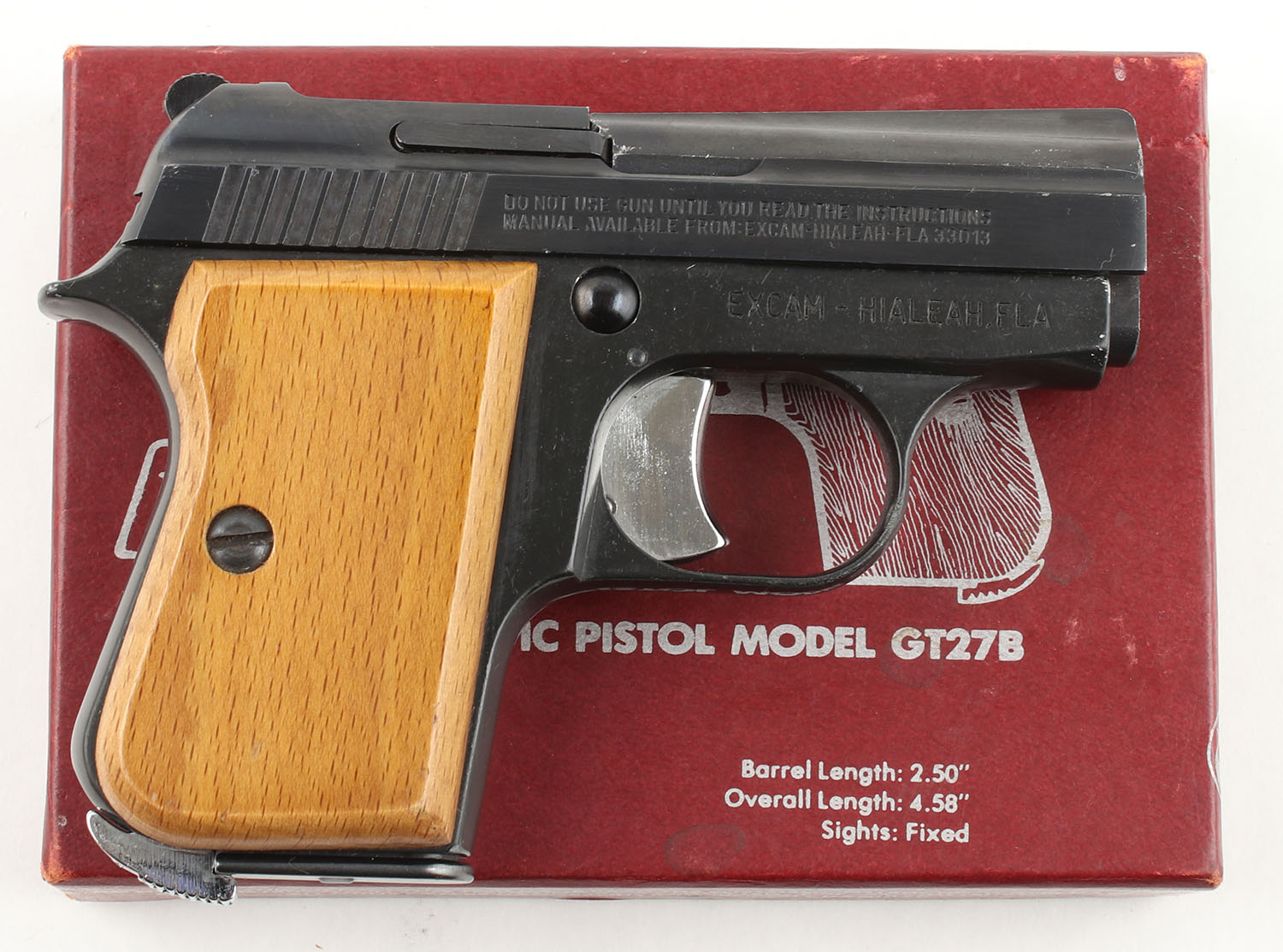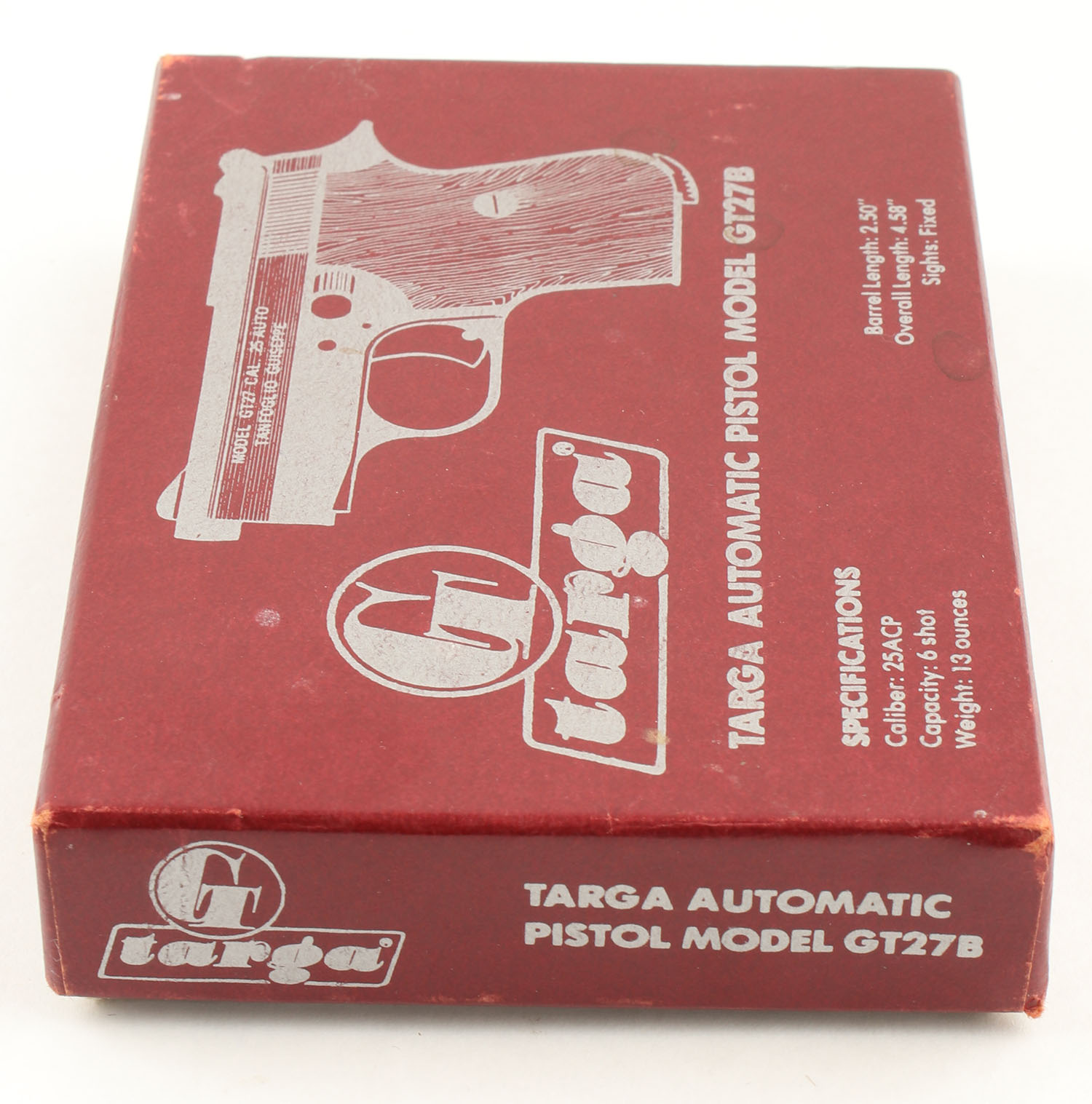BOXED Targa (Armi Tanfoglio Giuseppe), GT27B, CAL: 25 ACP, MFG: 1962-90, SN: MI91831, Semi Auto Pistol, 2 3/8'' Barrel. The wood grips are excellent with minimal wear. The black finish on the gun is excellent with minimal wear. Bore is excellent, the bore has machining marks & thin rifling but seems to be manufactured this way. Mechanically solid, seems to function well. The slide holds a square notch rear sight & the barrel holds an integral front ramp sight. The sights are fixed with an all black sight picture. Comes in the serially matching box with a magazine & an owners manual. FFL Req. - Value: 100 to 250