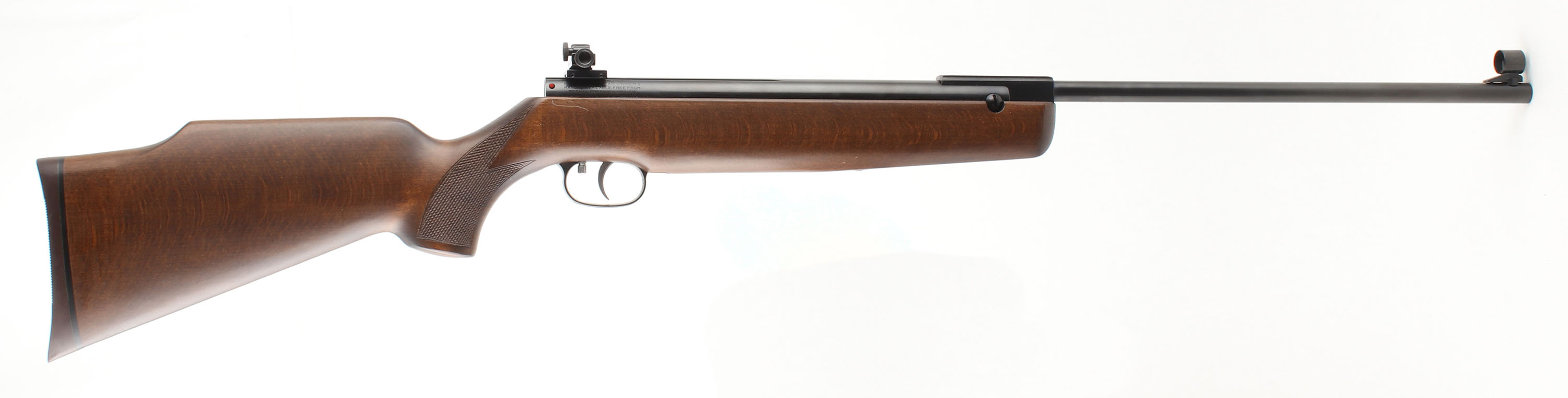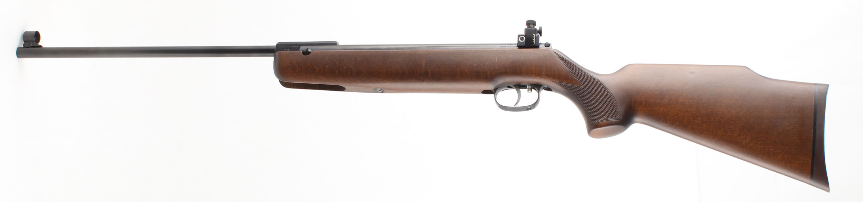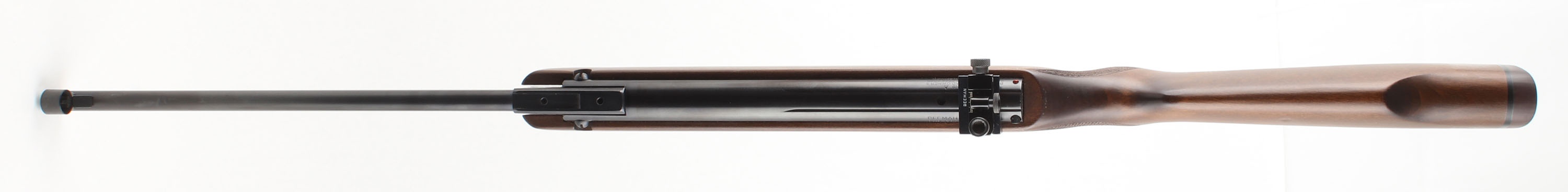 Beeman, Model R7, CAL: 4.5mm or .177 Pellet, MFG: 1983-2003, SN: 1439412B, Break Barrel Pump, 17'' barrel. Germany. Imported by Beeman. The checkered pistol grip Monte Carlo walnut stock is excellent, with virtually no handling marks to the excellent original finish. The metal blue finish rates excellent. Bore is excellent. Fitted with a Beeman fully adjustable receiver sight on factory grooved rails & silhouette blade front sight. Two-stage adjustable silver tone trigger. Stock is fitted with a Beeman solid recoil pad. Bore is excellent. The Beeman R7 K is a highly quality & accurate pellet rifle. Overall excellent. No FFL Req. - Value: 200 to 400