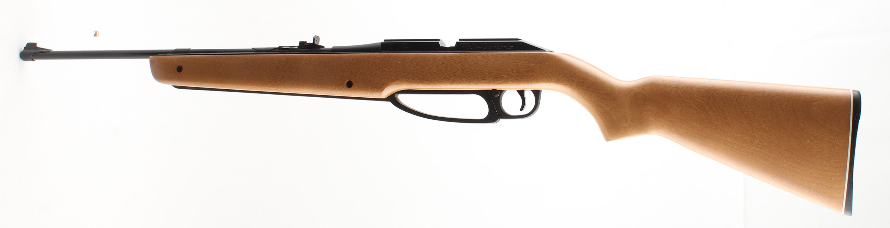 Daisy, Model 851 Powerline, CAL: .177 BB, MFG: 1982-84 SN: NA, Multi-stroke under lever pump pneumatic, 21.5'' Barrel. The flat pistol grip hardwood stocks are excellent. The metal blue finish rates excellent. Metal pump lever. Fitted with a factory adjustable rear & blade front sights. Stock carries a plastic buttplate. Appearance is excellent, however the air pressure seal leaks & doesn't hold pressure. Needs seal repair. No FFL Req. - Value: 25 to 50