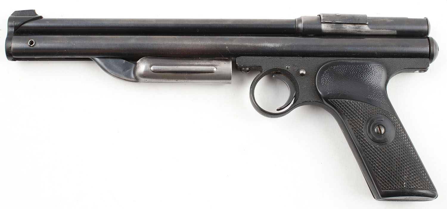 Crosman, Model 130, CAL: .22 cal. pellet, MFG: 1955-1970, SN: NA, Under lever pump pneumatic, 8.5'' Barrel. This is the second variant, with the formed metal pump handle. The checkered ''C'' logo plastic pistol grips are excellent. The metal blue finish rates 70%. Blade front sight, but missing the rear sight. Appearance is excellent, but does not hold pressure or fire. No FFL Req. - Value: 10 to 30