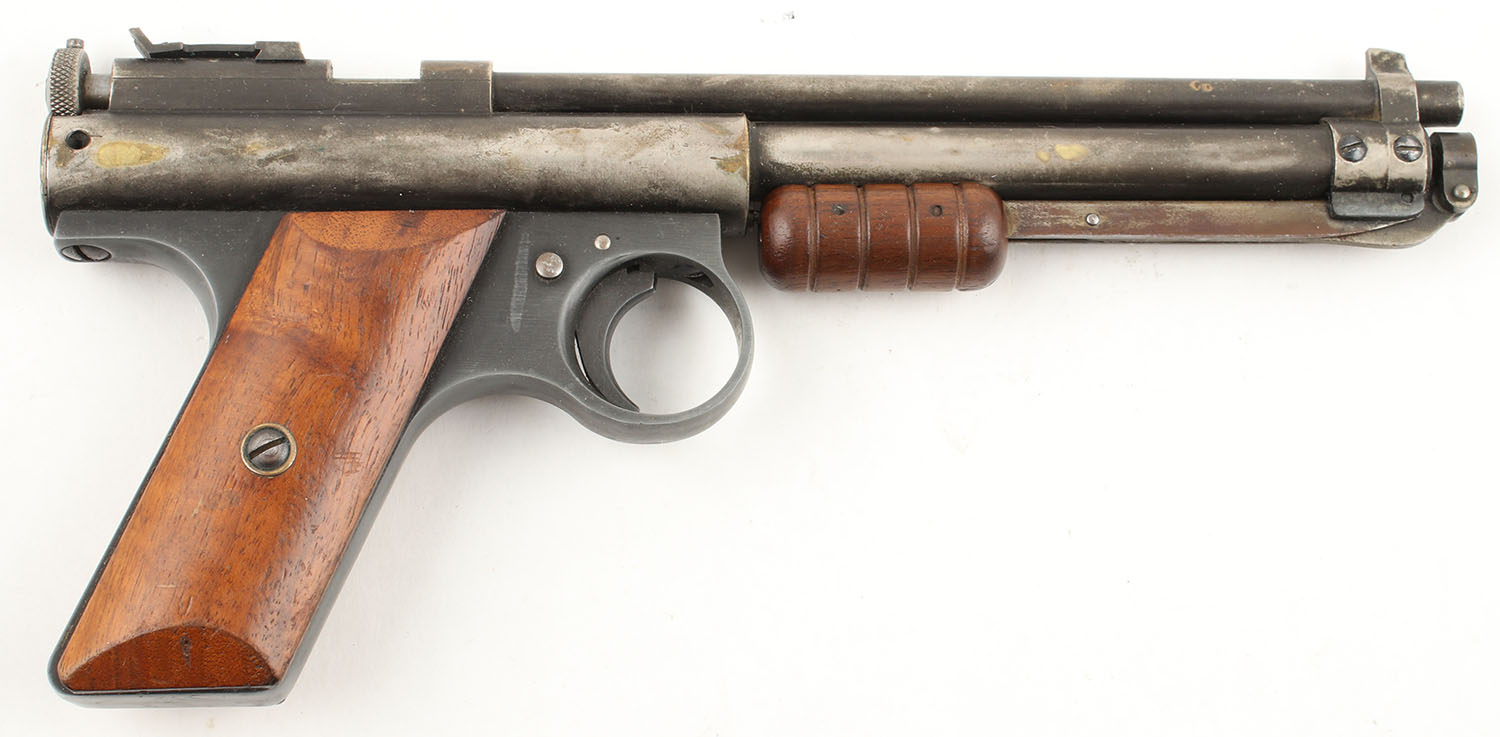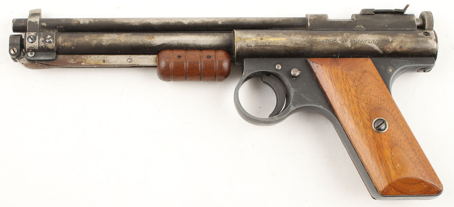 Benjamin Franklin Model 112 Air Rifle pistol .177 cal. Pump Pistol, Combination rod-at-the muzzle/lever hand (''grass-hopper'') pump-up pneumatic. SS. The wood stocks are excellent, Much of the metal finish is worn away. Bore is excellent. Does not appear to cock & fire correctly. Grade: Good - Value: 10 to 30