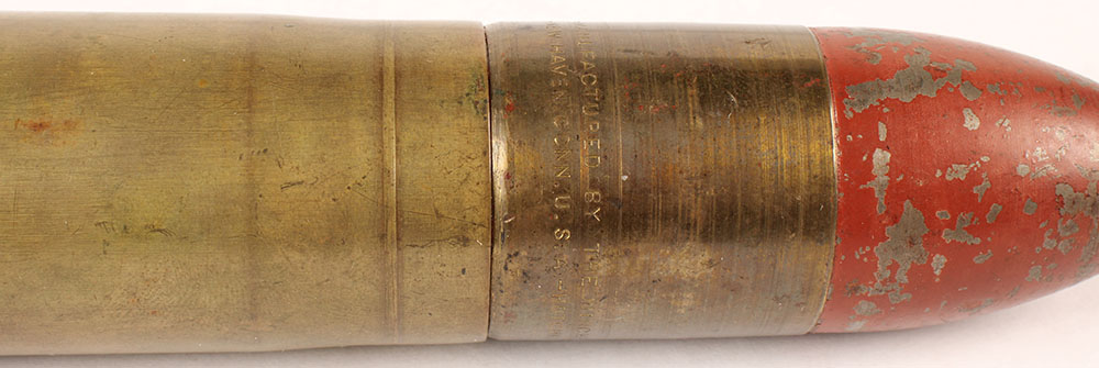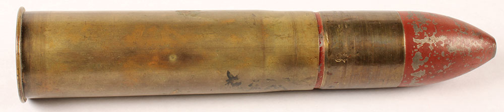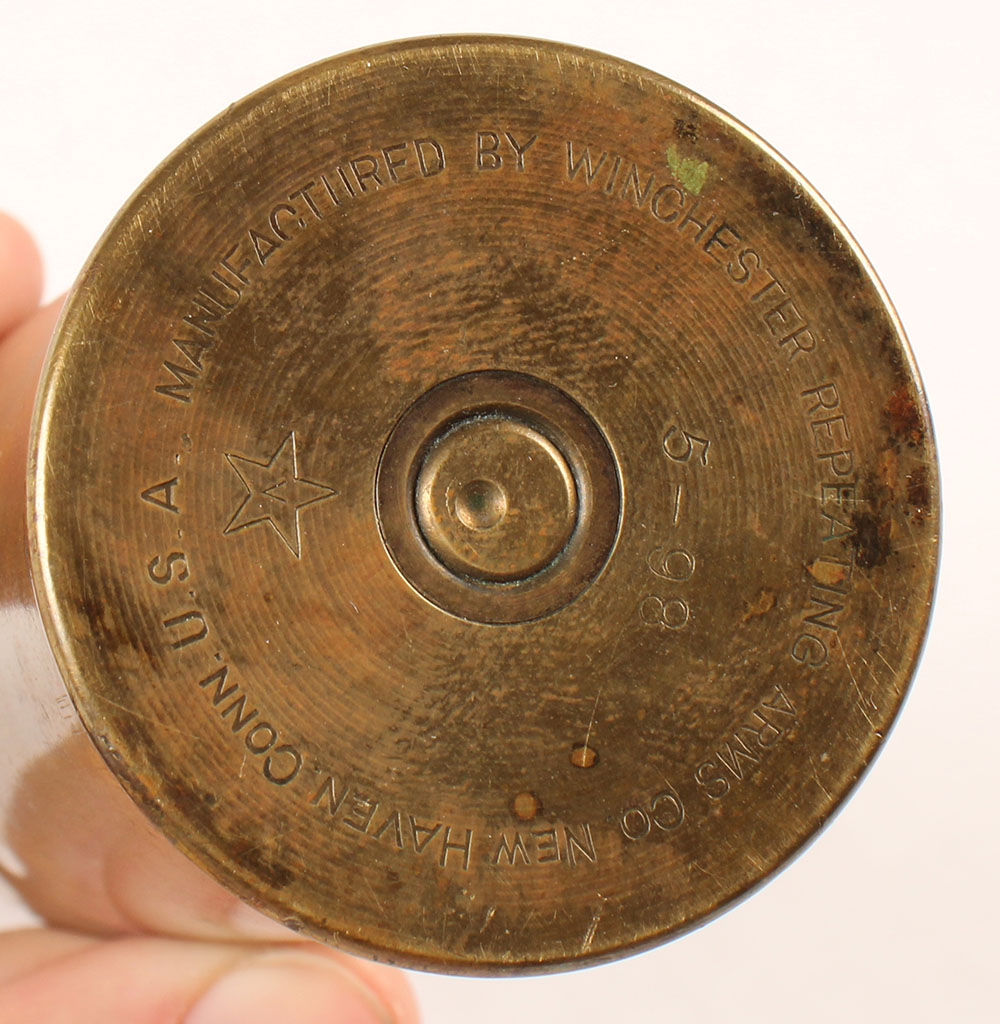 37x136mm Hotchkiss 1 pdr. HS:''MANUFACTURED BY THE WINCHESTER REPEATING ARMS Co. NEW HAVEN CONN. U.S.A.'' ''5-98'', Projectile is loose in the case and the base plug is missing. The brass driving band also shows manufacture by Winchester and mentioning American .37x136mm Hotchkiss 1 pdr by Winchester. Projectile is loose in the case and missing the base plug. The brass driving band also mention production by Winchester as well as mentioning a Hotchkiss patent. Grade Very Good. - Value: 50 to 100