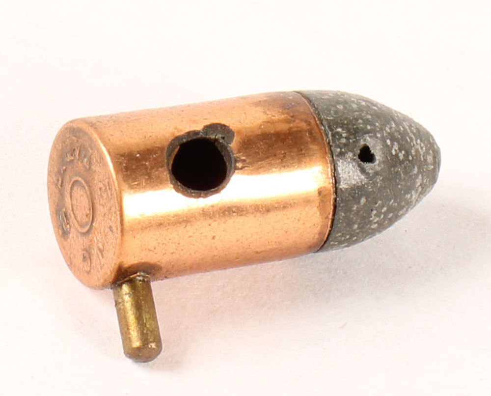 10mm Pinfire. HS:''JG /M PARIS 10'' around a circle, PT Lead with copper case. One non-factory hole in case. Grade Very Good - Value: 20 to 40
