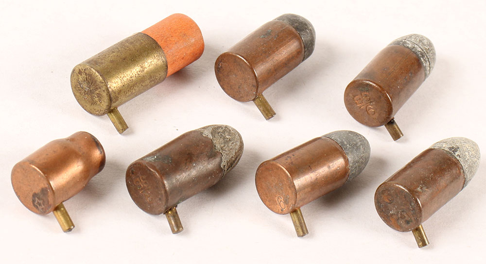 Lot of (7) 12mm Pinfire. HS:''H B PARIS'', RN Lead. Copper Case. HB=Houllier Blanchard. Grade Very Good - Value: 30 to 50