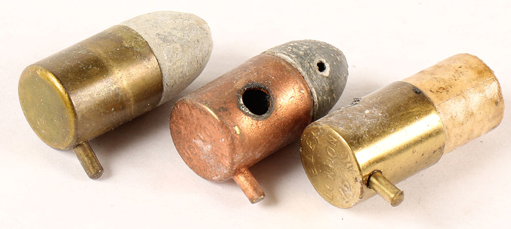 Lot of 3, 12mm Pinfire Cartridges. (2) HS:''ELEY LONDON 12M'' raised. 1--PT Lead, 1--Shot, Copper case and each has one non-factory hole in case. (1) NHS, PT Lead, brass case, no holes. Grade Very Good. - Value: 8 to 24