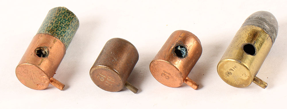 Lot of 4. 12mm Pinfire Cartridges. (1) HS:''12'', BLANK with white wad at top, copper case. (1) HS:''BB 12'', BLANK with tan wad at top, copper case. (1) HS:''C, 12 PILONI'', RN Lead with brass case. (1) HS:''12 M/M'', SHOT, with greenish paper over copper case and white wad at top. ALL have one non-factory hole in case. Grade Very Good - Value: 8 to 30