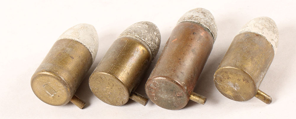 Lot of 4, 12mm Pinfire. All with Brass Case, (1) NHS. (1) HS:''U'' impressed. (1) HS:''ELEY LONDON 12 M''. (1) By Houlier Blanchard (case length .881''. All with PT Lead. Grade Very Good. - Value: 20 to 40