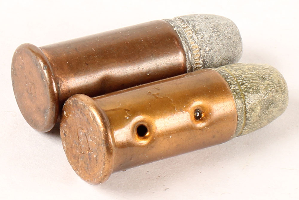 Lot of 2, .44 Henry Long Case. (1) HS:''U'' impressed. FN Lead BOARD DUMMY with two mounting holes. (1) HS:''H'' impressed, FN Lead. Grade Very Good. - Value: 30 to 60