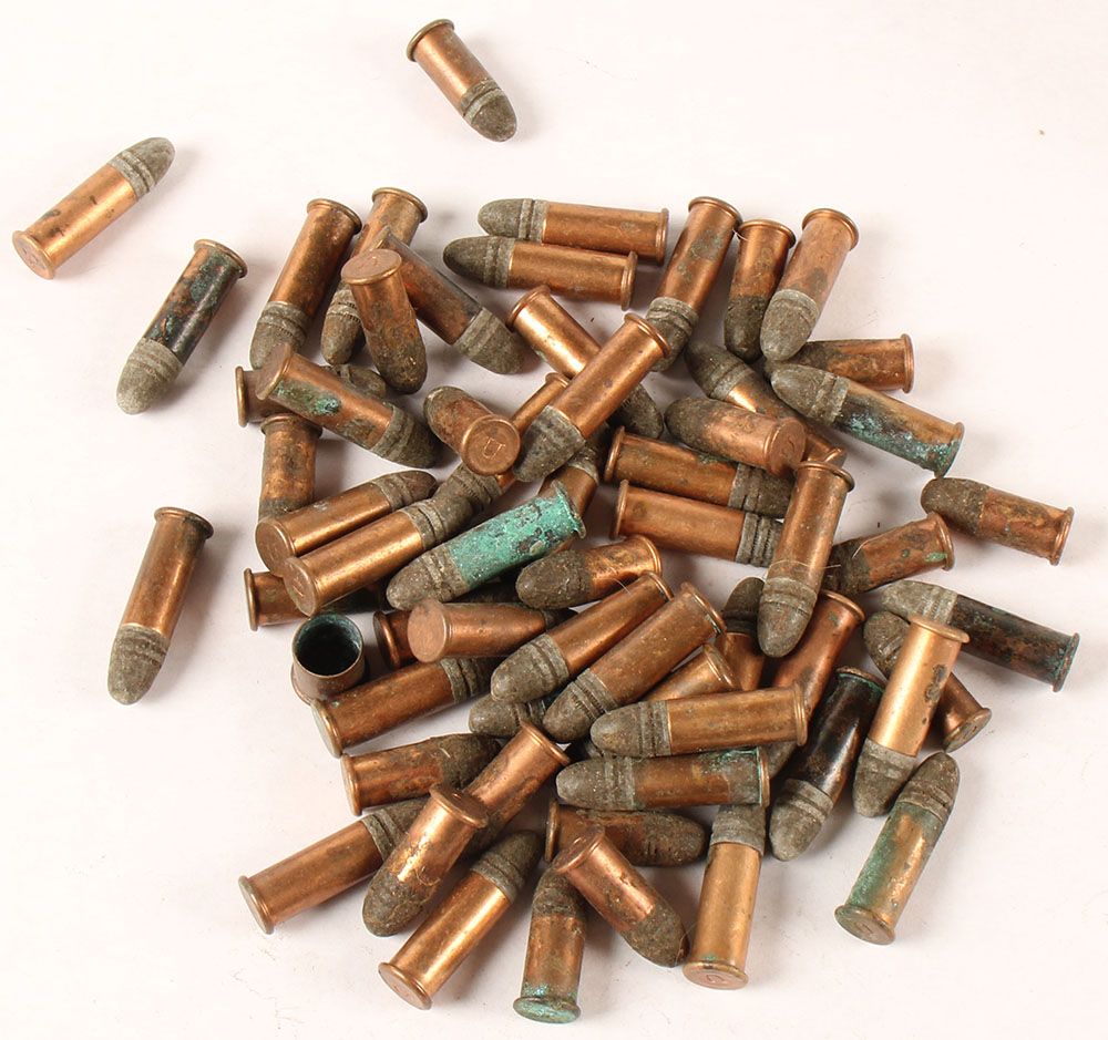 Lot of 60, .32 Rimfire cartridges. (41) .32 Long Rimfire, HS:''U'' impressed. R Lead. (19) .32 Short Rimfire, HS:''U'' impressed, RN Lead. Dirty but otherwise Grade Very Good. - Value: 70 to 300