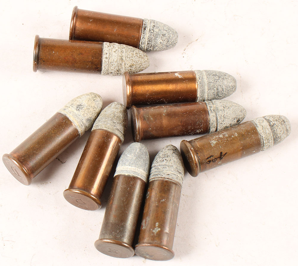 Lot of 9, 44 Long Rimfire: (2) HS:''D'' impressed, FN Lead. (2) HS:''U'' impressed, RN Lead. (1) HS:''H'' impressed, FN Lead. (4) NHS, Believed to be products of Dominion Cartridge, Smith & Wesson, C.D. Leet and Crittenden & Tibbels. See Behling I, pg 197-199. Grade Very Good. - Value: 100 to 400