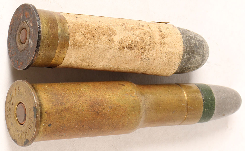 Lot of 2, British Cartridges. (1) .577 Snider, NHS, RN Lead (no wood plug), Paper over coil brass. (1) 577/450 Martini, HS:''KYNOCH 577/450'', RN PP (green) Lead. Grade Very Good - Value: 20 to 40