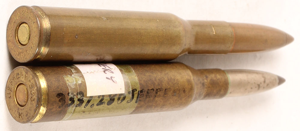 Lot of 2, British Sporting Cartridges. (1) 333 Nitro, HS:''KYNOCH .333 NITRO'', PT CJ Copper point. (1) .280 Nitro. HS:''JEFFERY 333 K'', PT CN Copper tip, Early production as they are necking down .333 cases. Grade Very Good - Value: 20 to 40