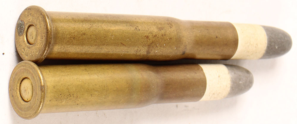 Lot of 2, American Sporting Cartridges. (1) 40-90 Sharps Bottleneck(2.62'' case). HS:''W.R.A.Co. 40-90'', FN PP Lead. (1) 40-70 Sharps & Remington Bottleneck (2.25'' case). NHS, FN PP Lead. Grade Very Good - Value: 20 to 40