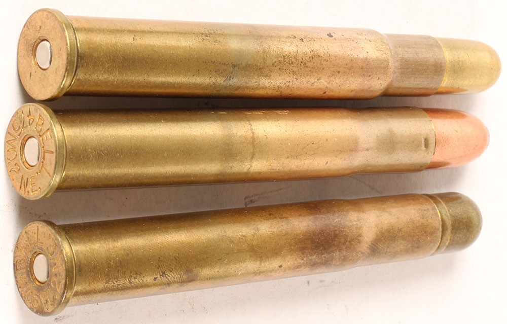 Lot of 3, .475x3.5'' Nitro. (2) HS:''BELL 475 NO.2 N.E., 1--RN Brass FMJ, 1--RN CJ SP. (1) NHS, RN Brass FMJ. Grade: Very Good ++ - Value: 10 to 60