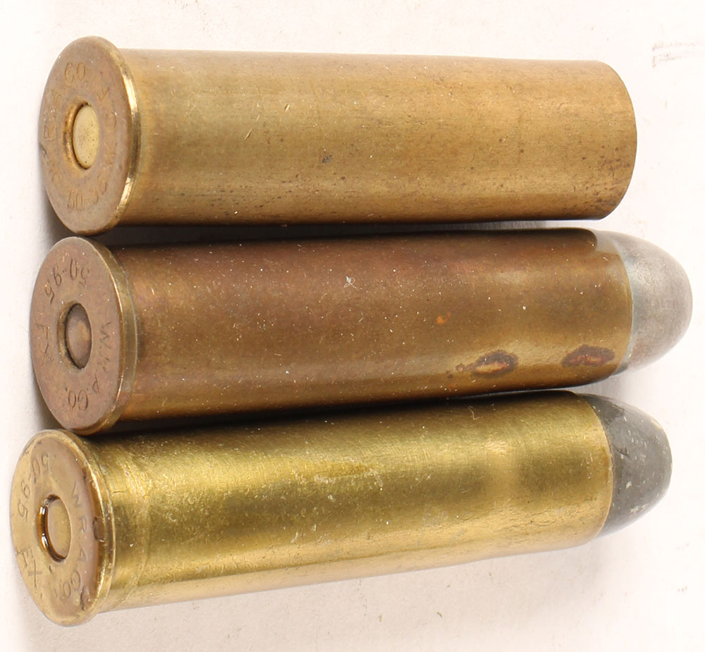 Lot of 3, 50-95 Winchester Express. HS:''W.R.A.Co. 50-95 EX.'', 1--FN Lead with copper tube. 1--FN Tinned FMJ, 1--Primed Empty Case. - Value: 50 to 100