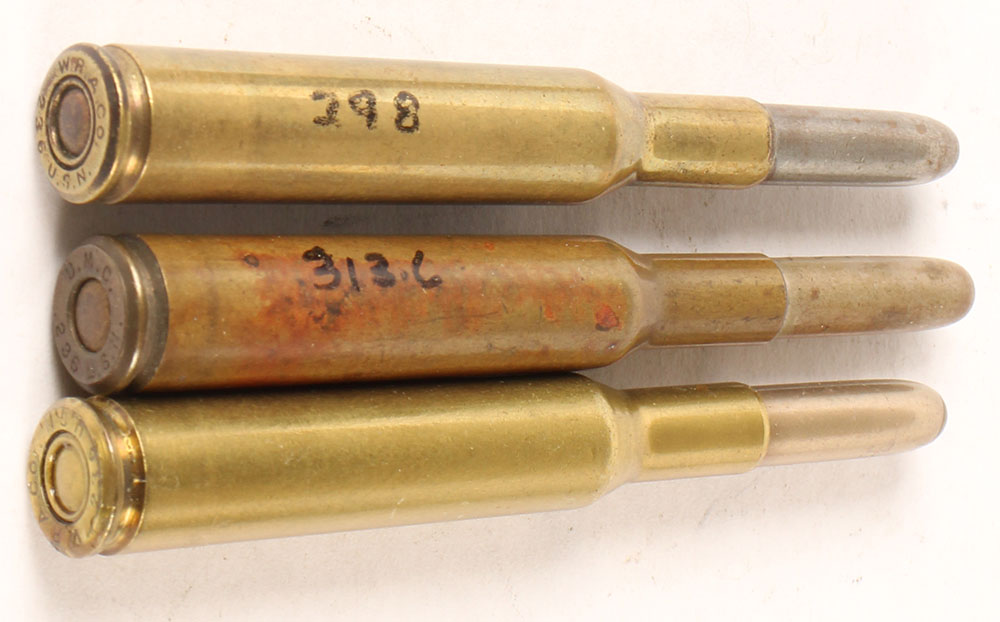 Lot of 3, .236 USN. (1) HS:''U.M.C. .236 U.S.N.'', RN CN FMJ--DUMMY with one small hole near bottom of case. (2) HS:''W.R.A.Co. .236 U.S.N.'', RN CN FMJ. Grade Very Good - Value: 30 to 60