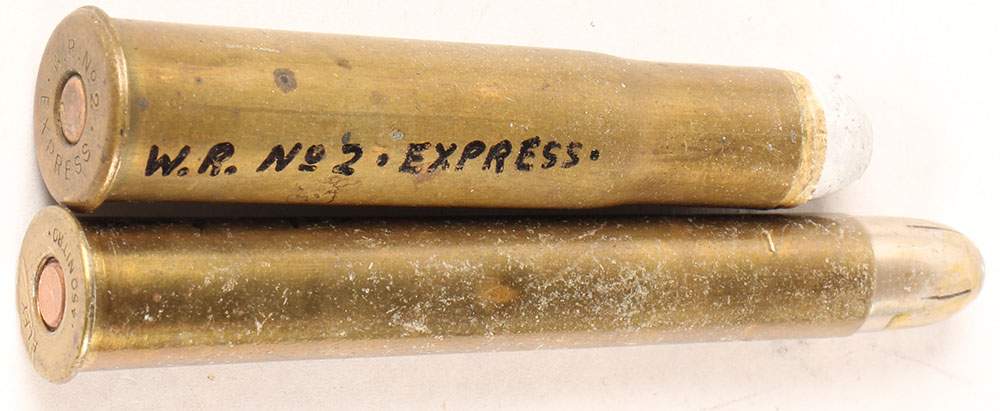 Lot of 2. British Sporting Cartridges. (1) 577-500 No 2 Express, HS:''W.R. No 2 EXPRESS'', FN PP Lead HP. (1) .450 Nitro (3.25'' case), HS:''ELEY .450 NITRO'', RN CN SP w/ slits. Grade Very Good - Value: 20 to 40