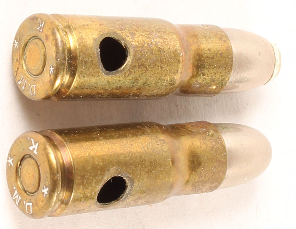 Lot of 2. 7.8mm Bergman, Mdl 1897. Both HS:''D.M. * K *'', 1-- RN CN FMJ. 1--RN CN SP. Both have one non-factory holes in case. Grade Very Good - Value: 10 to 60