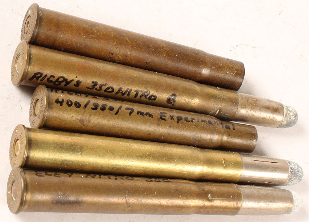 Lot of 5, .400-350 Rigby Rimmed. (3) HS:''RIGBY'S 350 NITRO GR'', 1--RN CN SP, 1--RN CN SP with slits, 1-- primed empty case. (1) HS:''RIGBY'S 350 CASE MADE IN AUSTRIA'', Fired case. (1) HS:''ELEY NITRO .350'', RN CN SP. Grade Very Good - Value: 20 to 40