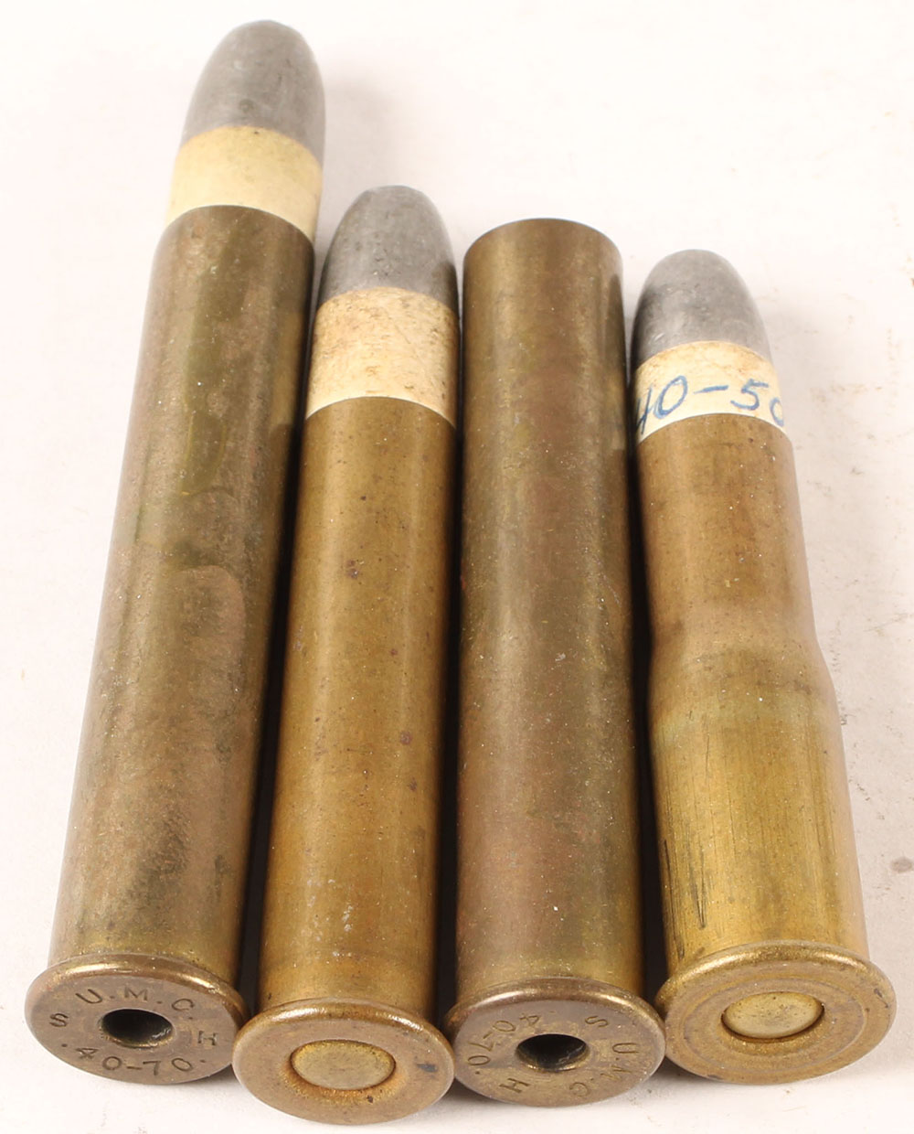 Lot of 4, American Sporting. (2) 40-70 Sharps Straight (2.37'' case), HS:''U.M.C. H 40-70 S'', FN PP Lead, No primers. (1) 40-50 Sharps Necked (1.7'' case), NHS, FN PP Lead, writing on paper patch. (1) 40-50 Sharps Straight (1.87'' case), FN PP Lead. Grade Very Good - Value: 30 to 60
