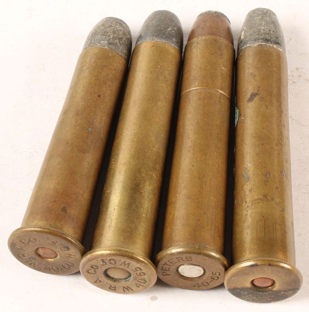 Lot of 4, American Sporting Cartridges. (1) 40-70 Sharps Straight (2.5'' case), HS:''W.R.A.Co. 40-70'', FN PP Lead. (1) 45-60 WCF, HS:''W.R.A.Co. 45-60'', FN Lead. (1) 45-75 Winchester, NHS, FN Lead. (1) 45-90 WCF, HS:''W.R.A.Co. 45-90 W.C.F.'', FN CN SP. Grade Very Good - Value: 30 to 60