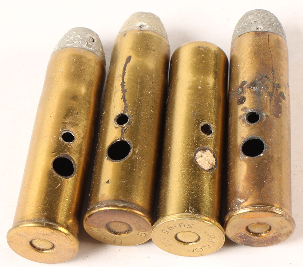 Lot of 4, 50-95 Winchester. (2) NHS, 1--FN Lead. 1--FN Lead with copper ''X'' tube. (1) HSL:W.R.A.Co. 50-95 EX, Shot?, Dark wad at top of case. (1) HS:''U.M.C. Co. 50-EX, FN Lead. All have two non-factory holes in case. Grade Very Good++ - Value: 30 to 60