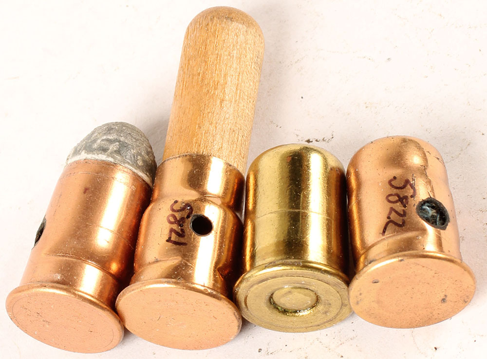 Lot of 4, .50 Pistol. (1) .50 Navy Pistol, NHS, RN Lead, Benet Primed. (1) .50 Army Pistol, NHS, by UMC, (1) .50 Army Pistol Blank, NHS, Inside Primed. (1) .50 Army Pistol Shot Cartridge, Long wood Sabot, Inside Primed. All have one non-factory hole in case. Grade Very Good++ - Value: 10 to 60