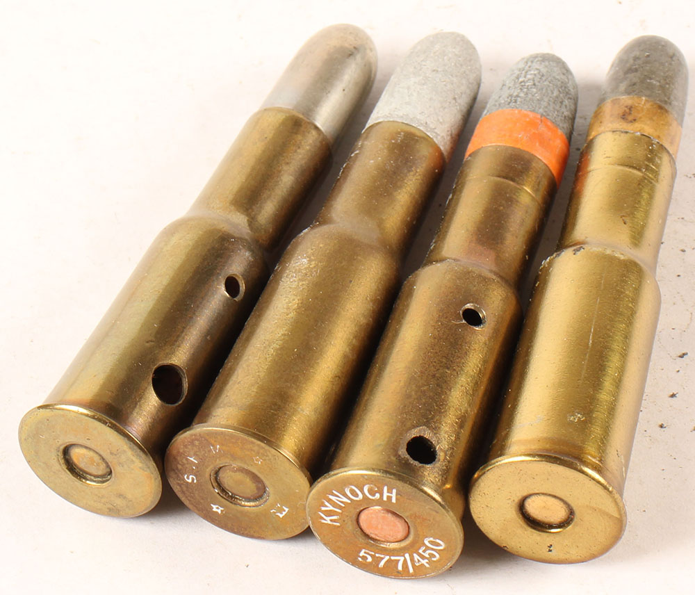Lot of 4. 577/450 Martini Henry. (1) HS:''SFM * GG *'', RN Lead. (1) HS:''KYNOCH 577/450'', RN PP Lead, orange paper patch. (1) NHS, RN PP Lead. (1) NHS, RN CN FMJ. Two non-factory holes in cases. Grade Very Good - Value: 20 to 40
